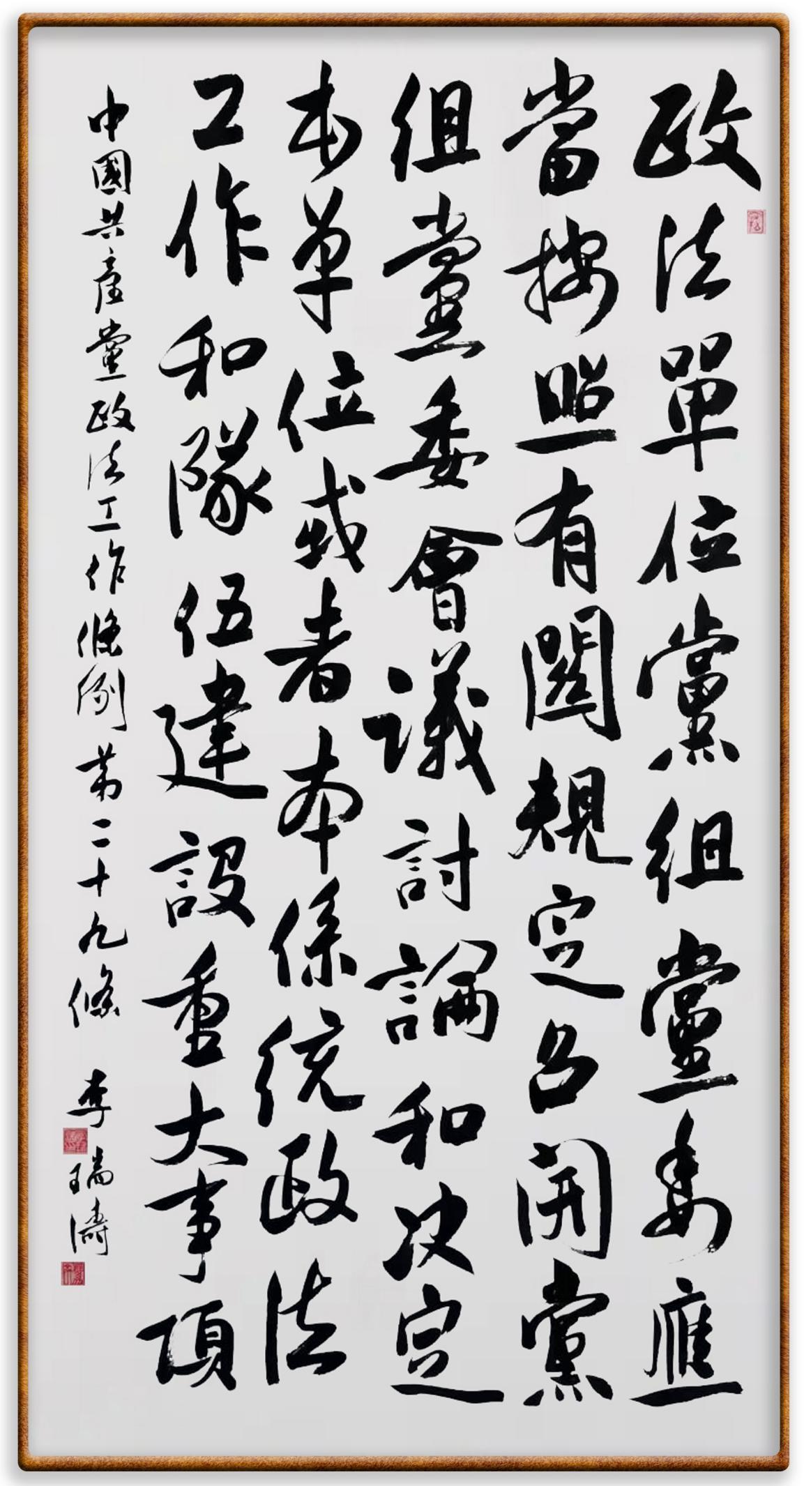 《中國(guó)共產(chǎn)黨政法工作條例》對(duì)黨領(lǐng)導(dǎo)新時(shí)代政法工作進(jìn)行全面制度擘畫(huà),為黨領(lǐng)導(dǎo)政法工作提供基本遵循,具有重大而深遠(yuǎn)的意義。為學(xué)習(xí)好、宣傳好、貫徹好、實(shí)施好這部黨內(nèi)法規(guī),繼《中華人民共和國(guó)民法典》《中華人民共和國(guó)憲法》《信訪工作條例》《中華人民共和國(guó)澳門特別行政區(qū)基本法》《中華人民共和國(guó)香港特別行政區(qū)基本法》等法律法規(guī)之后,“書(shū)·法”系列活動(dòng)將筆端對(duì)準(zhǔn)《中國(guó)共產(chǎn)黨政法工作條例》。