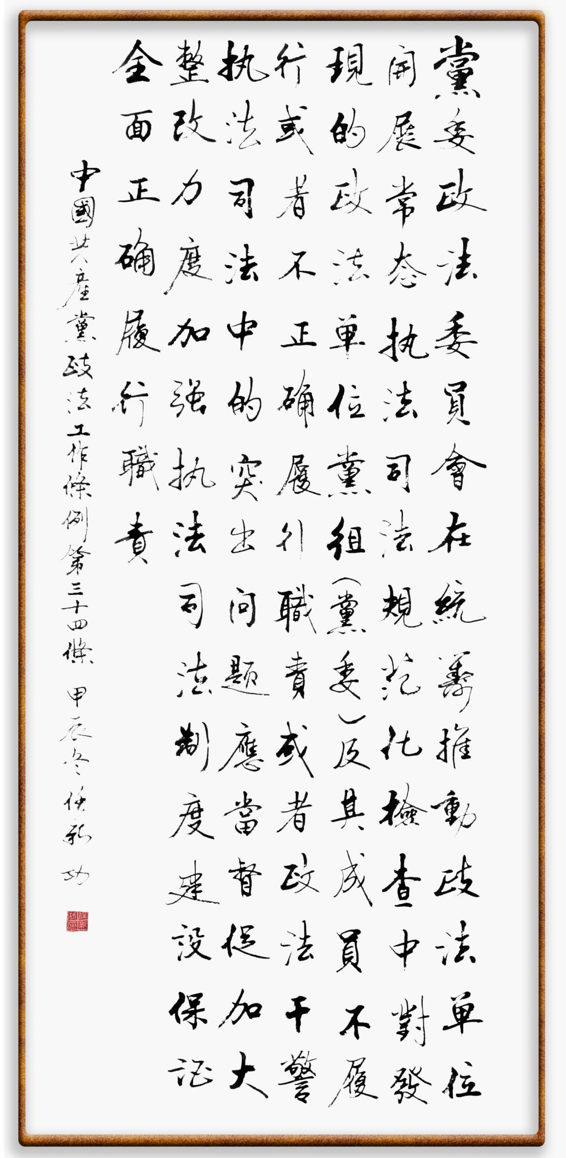 《中國(guó)共產(chǎn)黨政法工作條例》對(duì)黨領(lǐng)導(dǎo)新時(shí)代政法工作進(jìn)行全面制度擘畫,為黨領(lǐng)導(dǎo)政法工作提供基本遵循,具有重大而深遠(yuǎn)的意義。為學(xué)習(xí)好、宣傳好、貫徹好、實(shí)施好這部黨內(nèi)法規(guī),繼《中華人民共和國(guó)民法典》《中華人民共和國(guó)憲法》《信訪工作條例》《中華人民共和國(guó)澳門特別行政區(qū)基本法》《中華人民共和國(guó)香港特別行政區(qū)基本法》等法律法規(guī)之后,“書·法”系列活動(dòng)將筆端對(duì)準(zhǔn)《中國(guó)共產(chǎn)黨政法工作條例》。