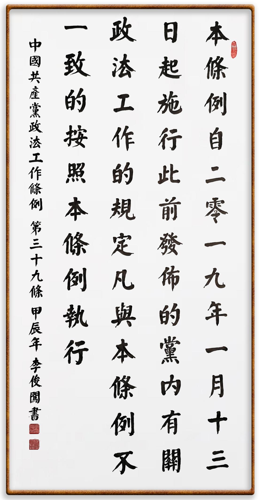 《中國(guó)共產(chǎn)黨政法工作條例》對(duì)黨領(lǐng)導(dǎo)新時(shí)代政法工作進(jìn)行全面制度擘畫,為黨領(lǐng)導(dǎo)政法工作提供基本遵循,具有重大而深遠(yuǎn)的意義。為學(xué)習(xí)好、宣傳好、貫徹好、實(shí)施好這部黨內(nèi)法規(guī),繼《中華人民共和國(guó)民法典》《中華人民共和國(guó)憲法》《信訪工作條例》《中華人民共和國(guó)澳門特別行政區(qū)基本法》《中華人民共和國(guó)香港特別行政區(qū)基本法》等法律法規(guī)之后,“書·法”系列活動(dòng)將筆端對(duì)準(zhǔn)《中國(guó)共產(chǎn)黨政法工作條例》。