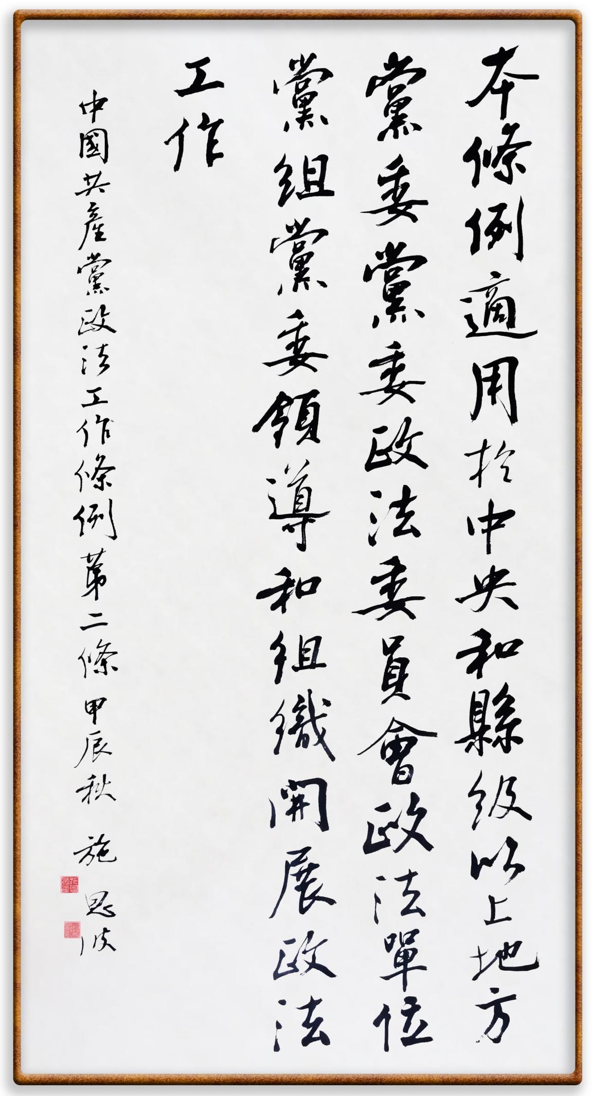 《中國共產(chǎn)黨政法工作條例》對黨領(lǐng)導新時代政法工作進行全面制度擘畫,為黨領(lǐng)導政法工作提供基本遵循,具有重大而深遠的意義。為學習好、宣傳好、貫徹好、實施好這部黨內(nèi)法規(guī),繼《中華人民共和國民法典》《中華人民共和國憲法》《信訪工作條例》《中華人民共和國澳門特別行政區(qū)基本法》《中華人民共和國香港特別行政區(qū)基本法》等法律法規(guī)之后,“書·法”系列活動將筆端對準《中國共產(chǎn)黨政法工作條例》。