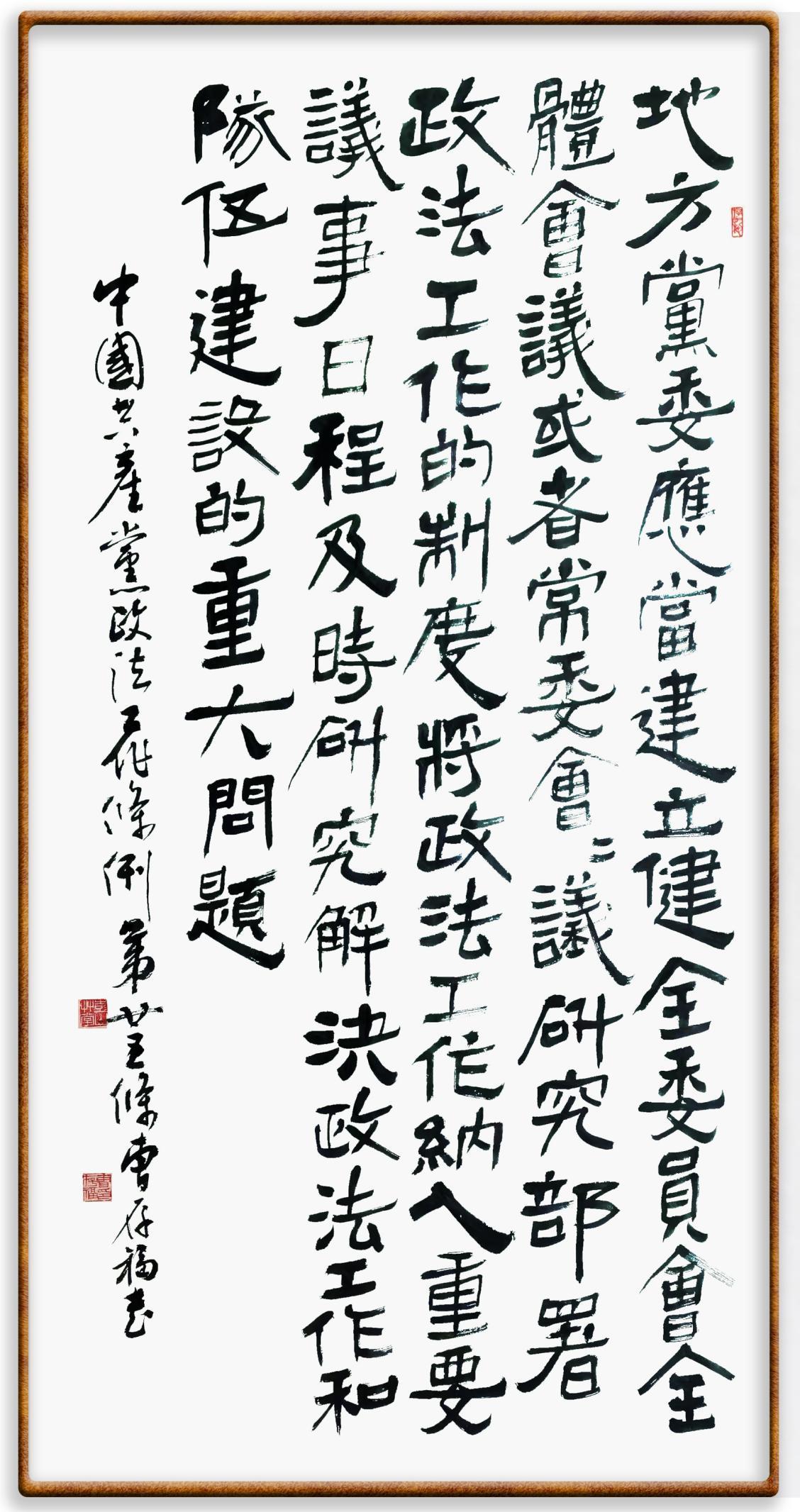 《中國共產(chǎn)黨政法工作條例》對黨領(lǐng)導(dǎo)新時代政法工作進(jìn)行全面制度擘畫,為黨領(lǐng)導(dǎo)政法工作提供基本遵循,具有重大而深遠(yuǎn)的意義。為學(xué)習(xí)好、宣傳好、貫徹好、實施好這部黨內(nèi)法規(guī),繼《中華人民共和國民法典》《中華人民共和國憲法》《信訪工作條例》《中華人民共和國澳門特別行政區(qū)基本法》《中華人民共和國香港特別行政區(qū)基本法》等法律法規(guī)之后,“書·法”系列活動將筆端對準(zhǔn)《中國共產(chǎn)黨政法工作條例》。