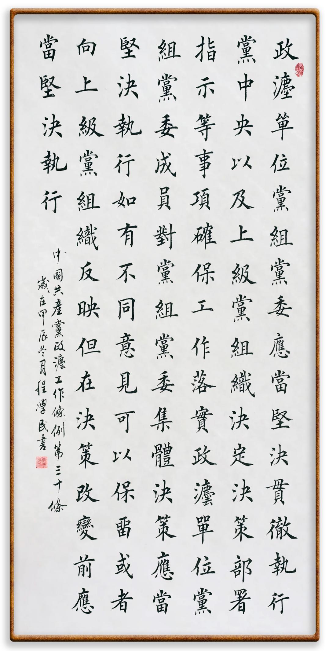 《中國共產(chǎn)黨政法工作條例》對黨領導新時代政法工作進行全面制度擘畫,為黨領導政法工作提供基本遵循,具有重大而深遠的意義。為學習好、宣傳好、貫徹好、實施好這部黨內法規(guī),繼《中華人民共和國民法典》《中華人民共和國憲法》《信訪工作條例》《中華人民共和國澳門特別行政區(qū)基本法》《中華人民共和國香港特別行政區(qū)基本法》等法律法規(guī)之后,“書·法”系列活動將筆端對準《中國共產(chǎn)黨政法工作條例》。