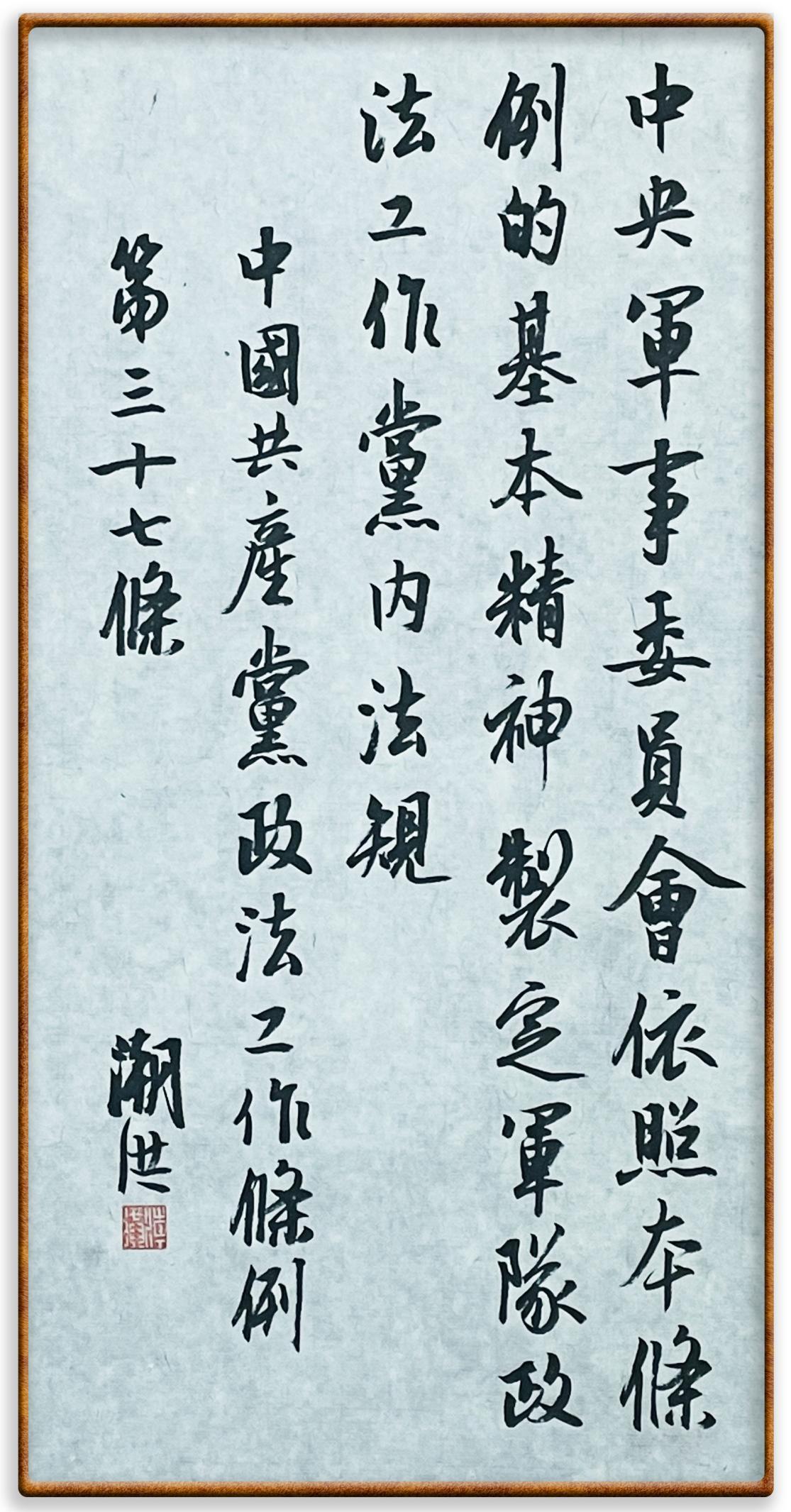 《中國共產(chǎn)黨政法工作條例》對黨領(lǐng)導(dǎo)新時代政法工作進行全面制度擘畫,為黨領(lǐng)導(dǎo)政法工作提供基本遵循,具有重大而深遠的意義。為學(xué)習(xí)好、宣傳好、貫徹好、實施好這部黨內(nèi)法規(guī),繼《中華人民共和國民法典》《中華人民共和國憲法》《信訪工作條例》《中華人民共和國澳門特別行政區(qū)基本法》《中華人民共和國香港特別行政區(qū)基本法》等法律法規(guī)之后,“書·法”系列活動將筆端對準《中國共產(chǎn)黨政法工作條例》。