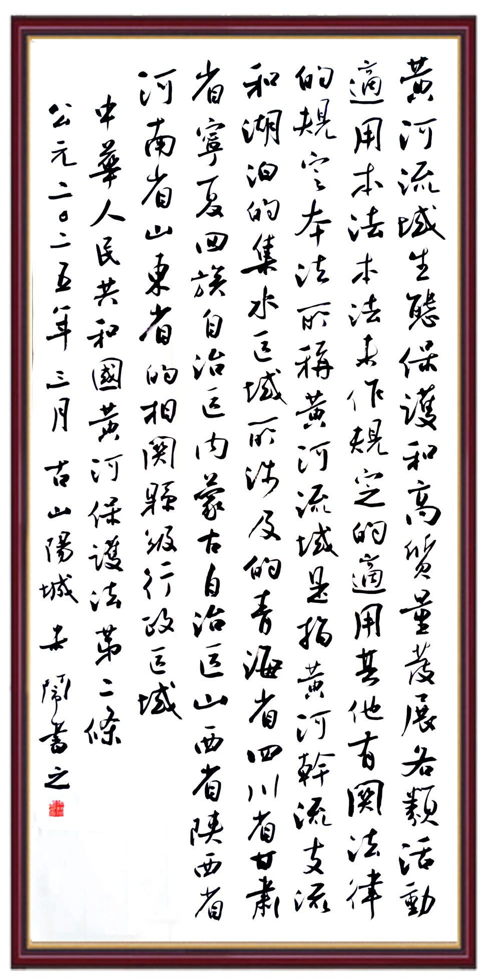 黃河寧,天下平。黃河是中華民族的發(fā)源地和搖籃,保護黃河是事關中華民族偉大復興的千秋大計?!吨腥A人民共和國黃河保護法》為推進水資源節(jié)約集約利用、保護傳承弘揚黃河文化、推動黃河流域生態(tài)保護和高質量發(fā)展提供了有力法治保障。繼書寫《中華人民共和國民法典》《中華人民共和國憲法》《中華人民共和國澳門特別行政區(qū)基本法》《中華人民共和國香港特別行政區(qū)基本法》《中華人民共和國國旗法》《中華人民共和國國徽法》《中華人民共和國國歌法》《中華人民共和國法官法》等法律法規(guī)之后,法制日報社聯(lián)合沿黃九?。▍^(qū))司法廳、書法家協(xié)會,將筆端對準《中華人民共和國黃河保護法》。