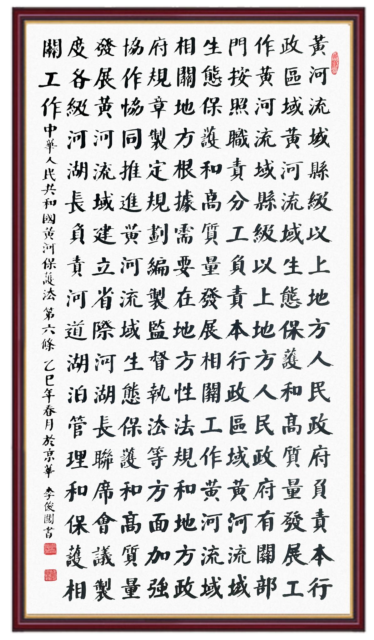黃河寧,天下平。黃河是中華民族的發(fā)源地和搖籃,保護黃河是事關中華民族偉大復興的千秋大計?!吨腥A人民共和國黃河保護法》為推進水資源節(jié)約集約利用、保護傳承弘揚黃河文化、推動黃河流域生態(tài)保護和高質量發(fā)展提供了有力法治保障。繼書寫《中華人民共和國民法典》《中華人民共和國憲法》《中華人民共和國澳門特別行政區(qū)基本法》《中華人民共和國香港特別行政區(qū)基本法》《中華人民共和國國旗法》《中華人民共和國國徽法》《中華人民共和國國歌法》《中華人民共和國法官法》等法律法規(guī)之后,法制日報社聯(lián)合沿黃九?。▍^(qū))司法廳、書法家協(xié)會,將筆端對準《中華人民共和國黃河保護法》。