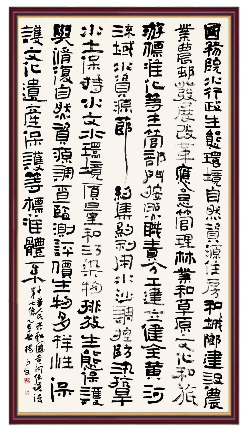 黃河寧,天下平。黃河是中華民族的發(fā)源地和搖籃,保護(hù)黃河是事關(guān)中華民族偉大復(fù)興的千秋大計(jì)。《中華人民共和國黃河保護(hù)法》為推進(jìn)水資源節(jié)約集約利用、保護(hù)傳承弘揚(yáng)黃河文化、推動黃河流域生態(tài)保護(hù)和高質(zhì)量發(fā)展提供了有力法治保障。繼書寫《中華人民共和國民法典》《中華人民共和國憲法》《中華人民共和國澳門特別行政區(qū)基本法》《中華人民共和國香港特別行政區(qū)基本法》《中華人民共和國國旗法》《中華人民共和國國徽法》《中華人民共和國國歌法》《中華人民共和國法官法》等法律法規(guī)之后,法制日報(bào)社聯(lián)合沿黃九?。▍^(qū))司法廳、書法家協(xié)會,將筆端對準(zhǔn)《中華人民共和國黃河保護(hù)法》。