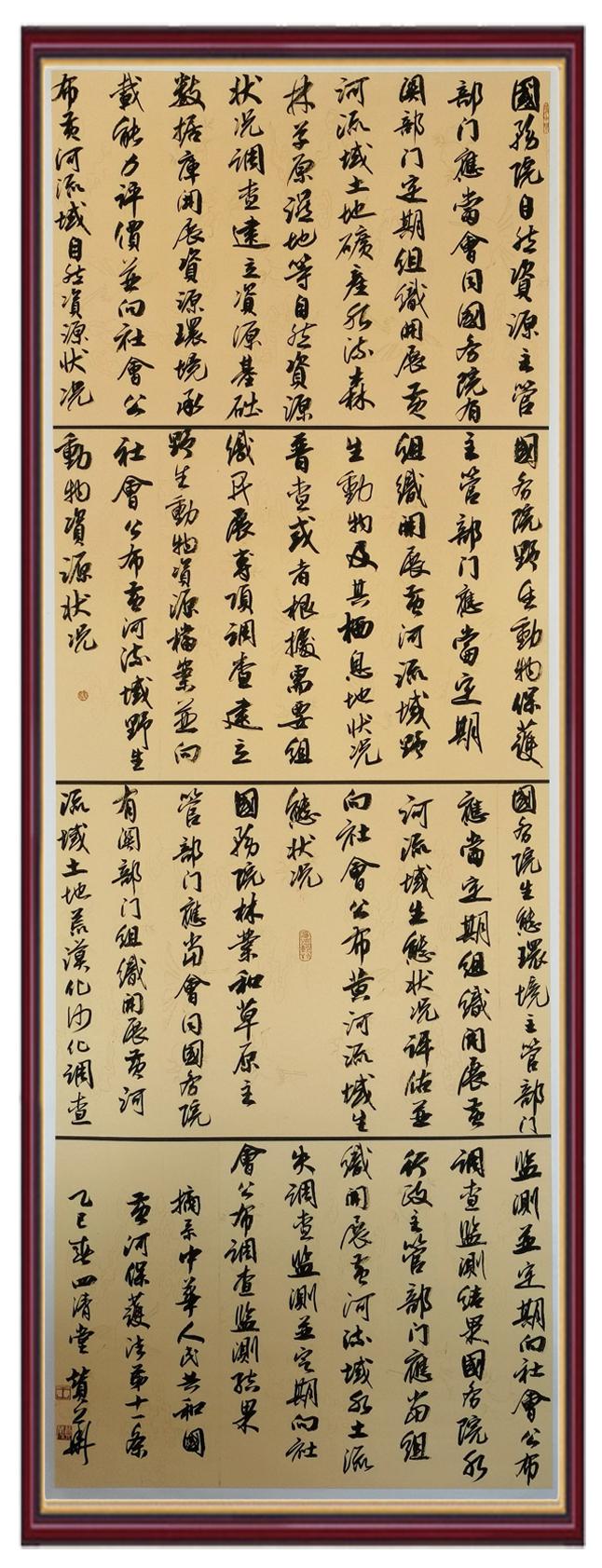 黃河寧,天下平。黃河是中華民族的發(fā)源地和搖籃,保護(hù)黃河是事關(guān)中華民族偉大復(fù)興的千秋大計(jì)。《中華人民共和國黃河保護(hù)法》為推進(jìn)水資源節(jié)約集約利用、保護(hù)傳承弘揚(yáng)黃河文化、推動(dòng)黃河流域生態(tài)保護(hù)和高質(zhì)量發(fā)展提供了有力法治保障。繼書寫《中華人民共和國民法典》《中華人民共和國憲法》《中華人民共和國澳門特別行政區(qū)基本法》《中華人民共和國香港特別行政區(qū)基本法》《中華人民共和國國旗法》《中華人民共和國國徽法》《中華人民共和國國歌法》《中華人民共和國法官法》等法律法規(guī)之后,法制日報(bào)社聯(lián)合沿黃九?。▍^(qū))司法廳、書法家協(xié)會(huì),將筆端對準(zhǔn)《中華人民共和國黃河保護(hù)法》。