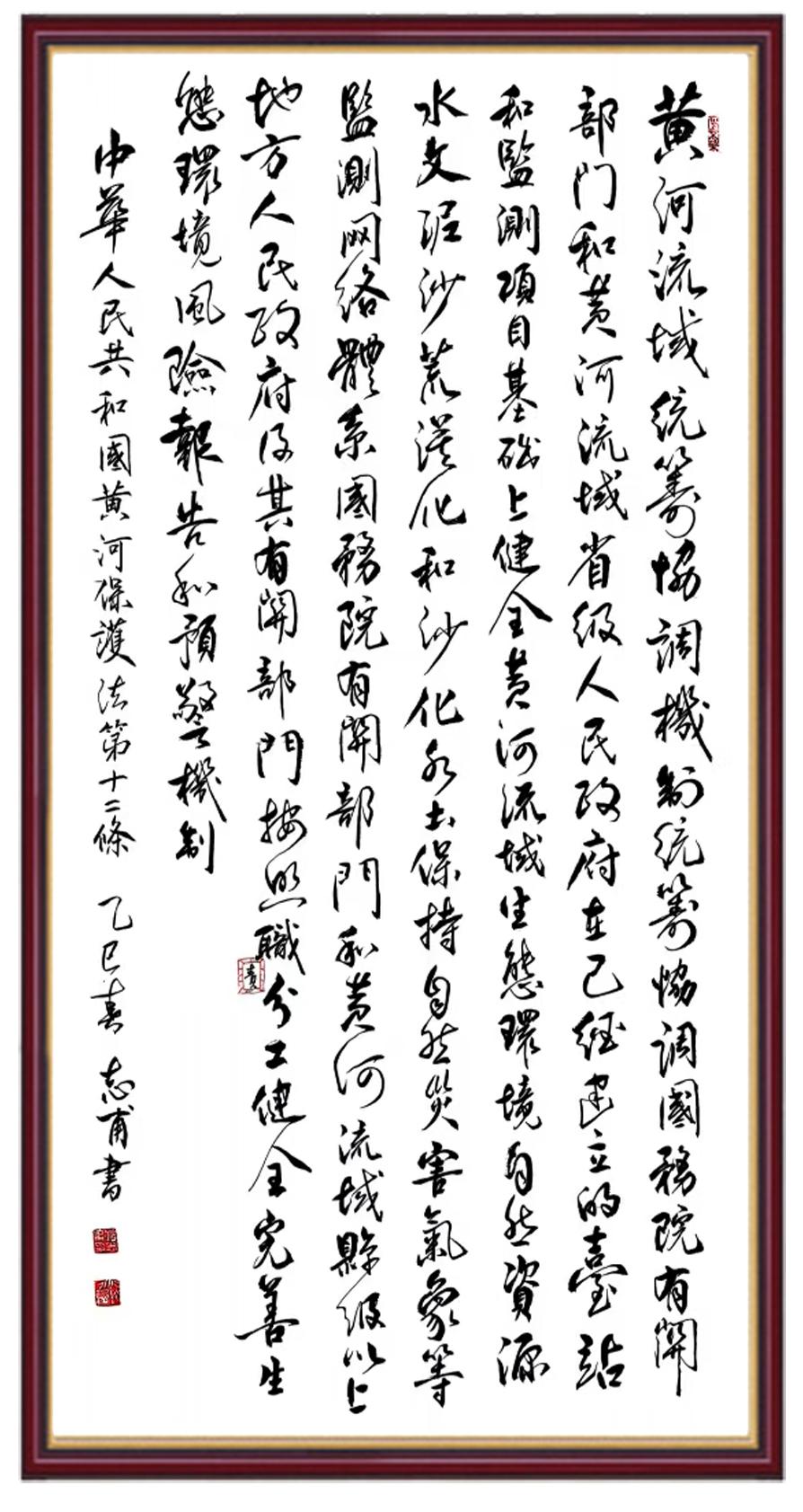 黃河寧,天下平。黃河是中華民族的發(fā)源地和搖籃,保護(hù)黃河是事關(guān)中華民族偉大復(fù)興的千秋大計(jì)。《中華人民共和國(guó)黃河保護(hù)法》為推進(jìn)水資源節(jié)約集約利用、保護(hù)傳承弘揚(yáng)黃河文化、推動(dòng)黃河流域生態(tài)保護(hù)和高質(zhì)量發(fā)展提供了有力法治保障。繼書(shū)寫(xiě)《中華人民共和國(guó)民法典》《中華人民共和國(guó)憲法》《中華人民共和國(guó)澳門(mén)特別行政區(qū)基本法》《中華人民共和國(guó)香港特別行政區(qū)基本法》《中華人民共和國(guó)國(guó)旗法》《中華人民共和國(guó)國(guó)徽法》《中華人民共和國(guó)國(guó)歌法》《中華人民共和國(guó)法官法》等法律法規(guī)之后,法制日?qǐng)?bào)社聯(lián)合沿黃九?。▍^(qū))司法廳、書(shū)法家協(xié)會(huì),將筆端對(duì)準(zhǔn)《中華人民共和國(guó)黃河保護(hù)法》。