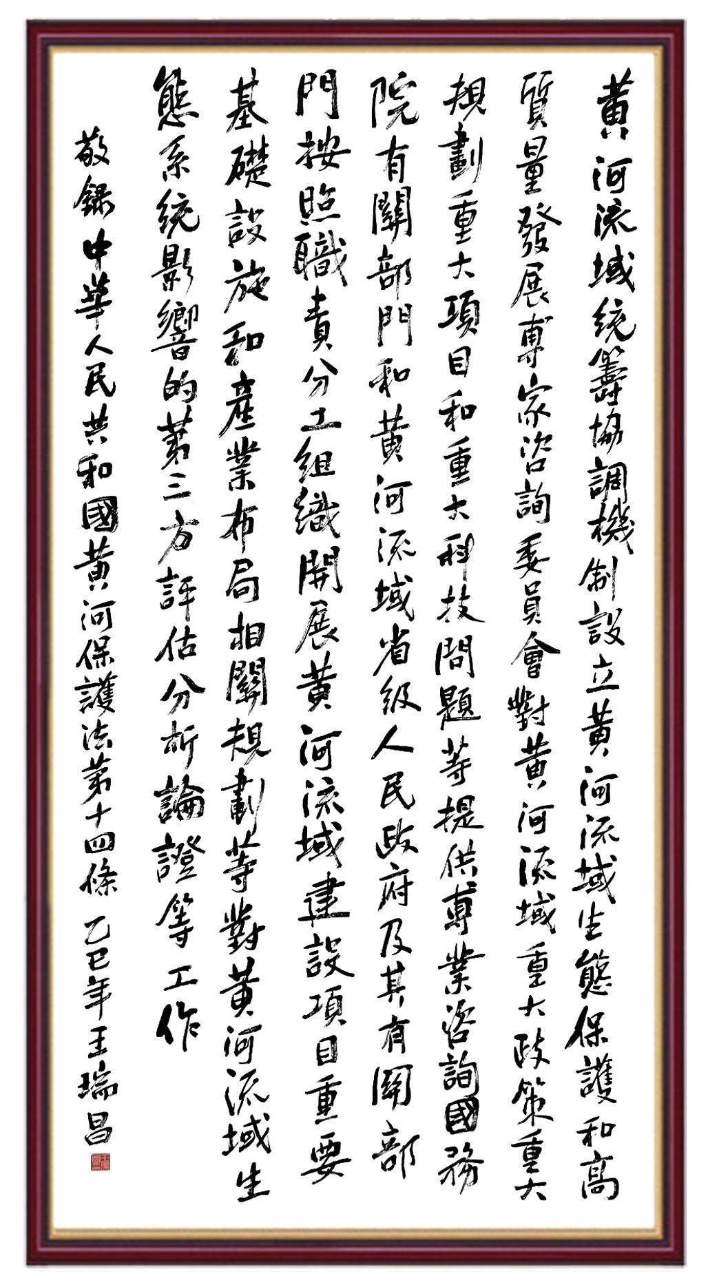 黃河寧,天下平。黃河是中華民族的發(fā)源地和搖籃,保護(hù)黃河是事關(guān)中華民族偉大復(fù)興的千秋大計(jì)?!吨腥A人民共和國黃河保護(hù)法》為推進(jìn)水資源節(jié)約集約利用、保護(hù)傳承弘揚(yáng)黃河文化、推動(dòng)黃河流域生態(tài)保護(hù)和高質(zhì)量發(fā)展提供了有力法治保障。繼書寫《中華人民共和國民法典》《中華人民共和國憲法》《中華人民共和國澳門特別行政區(qū)基本法》《中華人民共和國香港特別行政區(qū)基本法》《中華人民共和國國旗法》《中華人民共和國國徽法》《中華人民共和國國歌法》《中華人民共和國法官法》等法律法規(guī)之后,法制日?qǐng)?bào)社聯(lián)合沿黃九?。▍^(qū))司法廳、書法家協(xié)會(huì),將筆端對(duì)準(zhǔn)《中華人民共和國黃河保護(hù)法》。