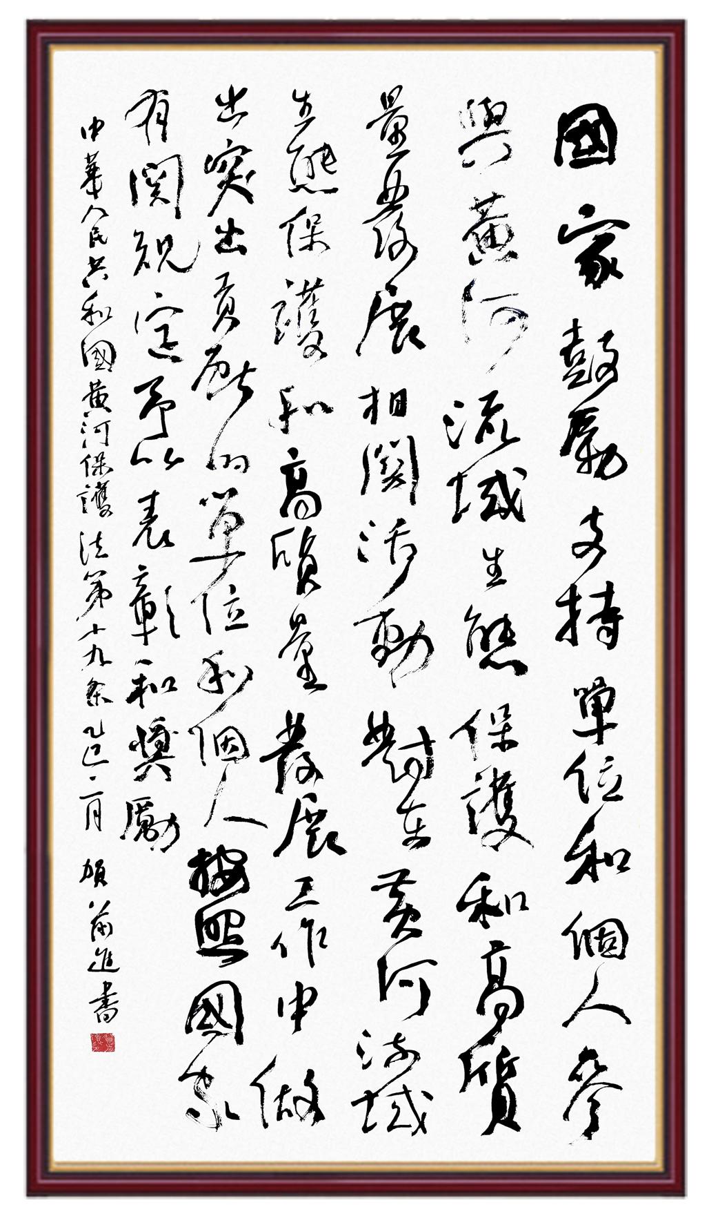 黃河寧,天下平。黃河是中華民族的發(fā)源地和搖籃,保護(hù)黃河是事關(guān)中華民族偉大復(fù)興的千秋大計(jì)?!吨腥A人民共和國黃河保護(hù)法》為推進(jìn)水資源節(jié)約集約利用、保護(hù)傳承弘揚(yáng)黃河文化、推動黃河流域生態(tài)保護(hù)和高質(zhì)量發(fā)展提供了有力法治保障。繼書寫《中華人民共和國民法典》《中華人民共和國憲法》《中華人民共和國澳門特別行政區(qū)基本法》《中華人民共和國香港特別行政區(qū)基本法》《中華人民共和國國旗法》《中華人民共和國國徽法》《中華人民共和國國歌法》《中華人民共和國法官法》等法律法規(guī)之后,法制日報(bào)社聯(lián)合沿黃九省(區(qū))司法廳、書法家協(xié)會,將筆端對準(zhǔn)《中華人民共和國黃河保護(hù)法》。