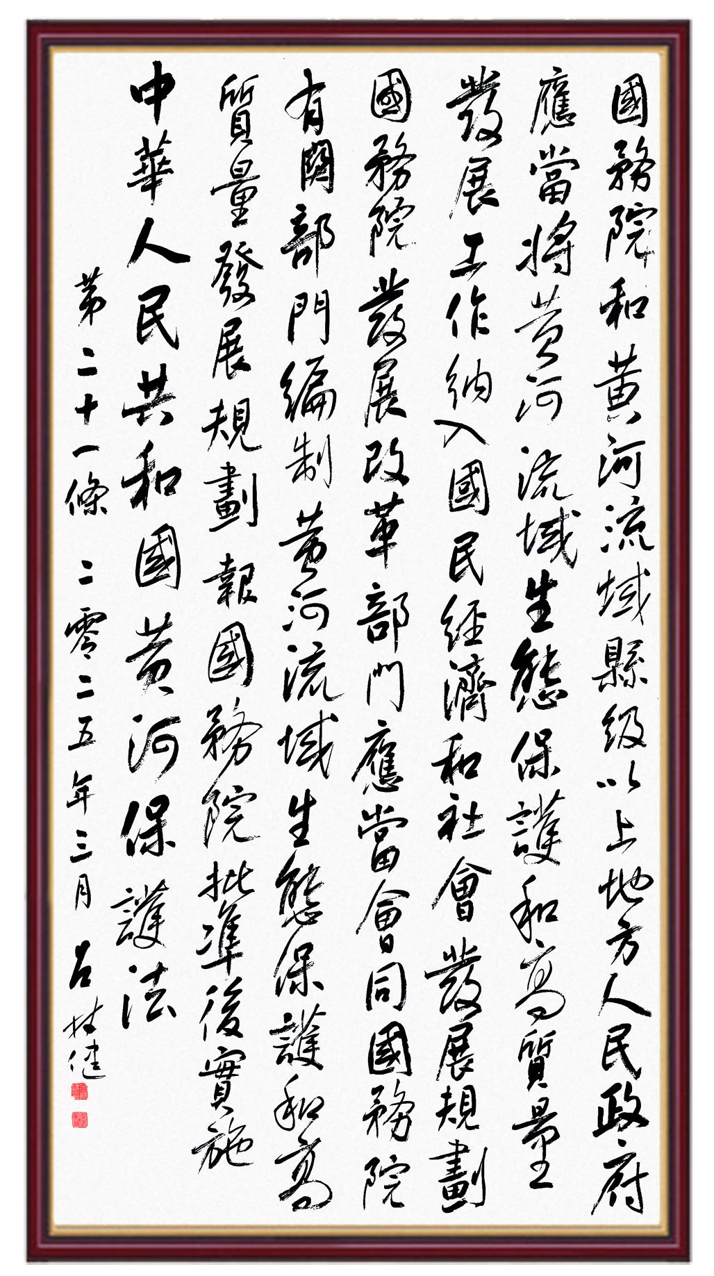 黃河寧,天下平。黃河是中華民族的發(fā)源地和搖籃,保護(hù)黃河是事關(guān)中華民族偉大復(fù)興的千秋大計(jì)?!吨腥A人民共和國(guó)黃河保護(hù)法》為推進(jìn)水資源節(jié)約集約利用、保護(hù)傳承弘揚(yáng)黃河文化、推動(dòng)黃河流域生態(tài)保護(hù)和高質(zhì)量發(fā)展提供了有力法治保障。繼書(shū)寫(xiě)《中華人民共和國(guó)民法典》《中華人民共和國(guó)憲法》《中華人民共和國(guó)澳門(mén)特別行政區(qū)基本法》《中華人民共和國(guó)香港特別行政區(qū)基本法》《中華人民共和國(guó)國(guó)旗法》《中華人民共和國(guó)國(guó)徽法》《中華人民共和國(guó)國(guó)歌法》《中華人民共和國(guó)法官法》等法律法規(guī)之后,法制日?qǐng)?bào)社聯(lián)合沿黃九省(區(qū))司法廳、書(shū)法家協(xié)會(huì),將筆端對(duì)準(zhǔn)《中華人民共和國(guó)黃河保護(hù)法》。