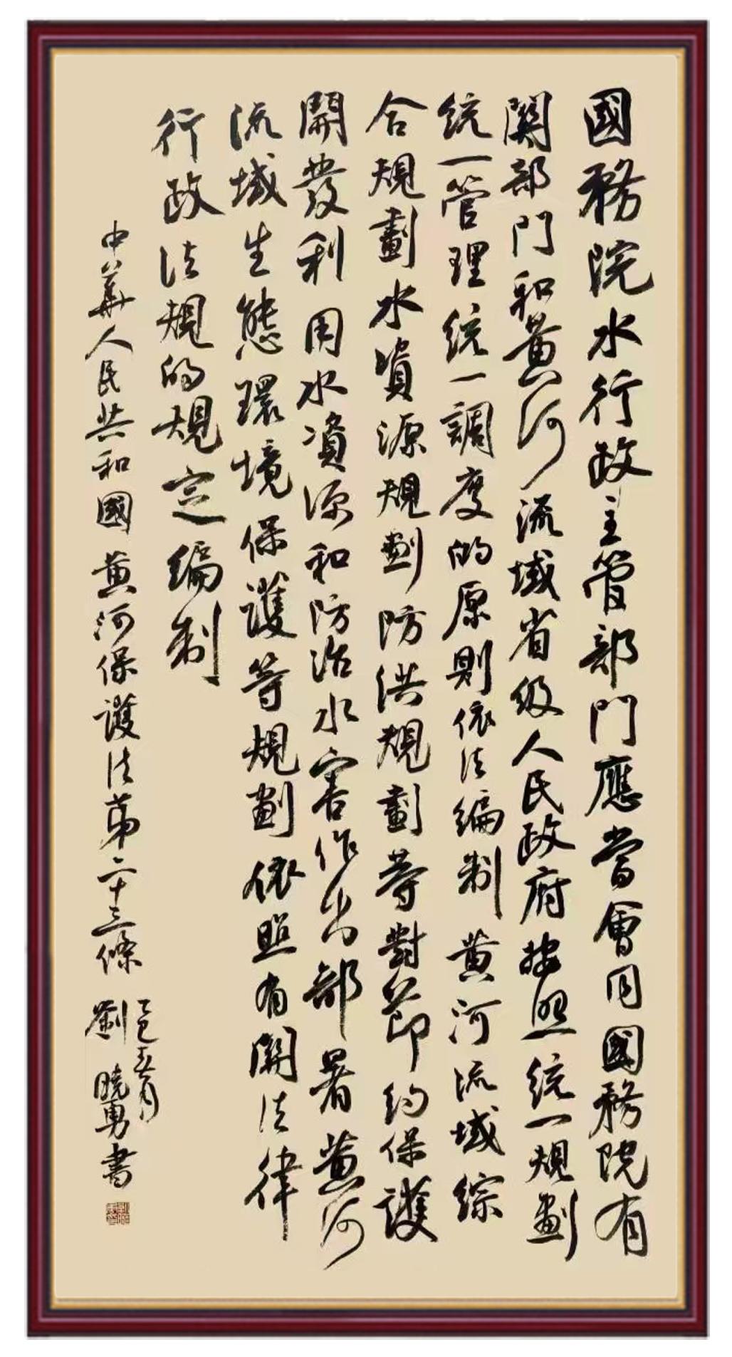 黃河寧,天下平。黃河是中華民族的發(fā)源地和搖籃,保護(hù)黃河是事關(guān)中華民族偉大復(fù)興的千秋大計。《中華人民共和國黃河保護(hù)法》為推進(jìn)水資源節(jié)約集約利用、保護(hù)傳承弘揚(yáng)黃河文化、推動黃河流域生態(tài)保護(hù)和高質(zhì)量發(fā)展提供了有力法治保障。繼書寫《中華人民共和國民法典》《中華人民共和國憲法》《中華人民共和國澳門特別行政區(qū)基本法》《中華人民共和國香港特別行政區(qū)基本法》《中華人民共和國國旗法》《中華人民共和國國徽法》《中華人民共和國國歌法》《中華人民共和國法官法》等法律法規(guī)之后,法制日報社聯(lián)合沿黃九?。▍^(qū))司法廳、書法家協(xié)會,將筆端對準(zhǔn)《中華人民共和國黃河保護(hù)法》。
