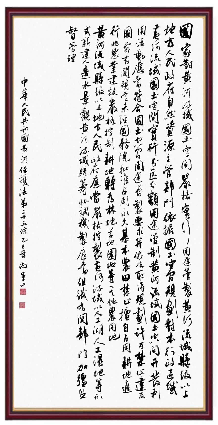黃河寧,天下平。黃河是中華民族的發(fā)源地和搖籃,保護(hù)黃河是事關(guān)中華民族偉大復(fù)興的千秋大計(jì)?!吨腥A人民共和國(guó)黃河保護(hù)法》為推進(jìn)水資源節(jié)約集約利用、保護(hù)傳承弘揚(yáng)黃河文化、推動(dòng)黃河流域生態(tài)保護(hù)和高質(zhì)量發(fā)展提供了有力法治保障。繼書寫《中華人民共和國(guó)民法典》《中華人民共和國(guó)憲法》《中華人民共和國(guó)澳門特別行政區(qū)基本法》《中華人民共和國(guó)香港特別行政區(qū)基本法》《中華人民共和國(guó)國(guó)旗法》《中華人民共和國(guó)國(guó)徽法》《中華人民共和國(guó)國(guó)歌法》《中華人民共和國(guó)法官法》等法律法規(guī)之后,法制日?qǐng)?bào)社聯(lián)合沿黃九?。▍^(qū))司法廳、書法家協(xié)會(huì),將筆端對(duì)準(zhǔn)《中華人民共和國(guó)黃河保護(hù)法》。