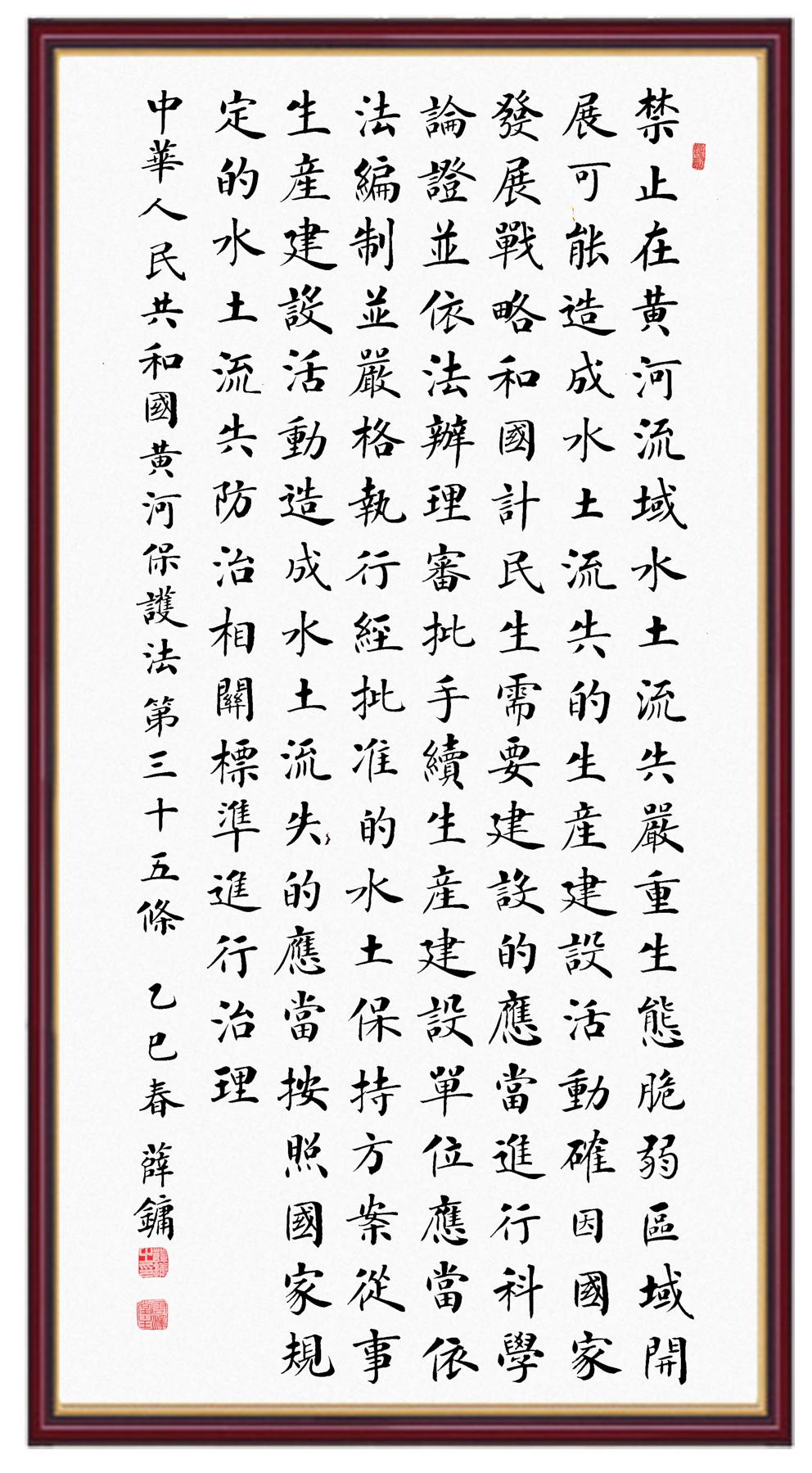 黃河寧,天下平。黃河是中華民族的發(fā)源地和搖籃,保護黃河是事關(guān)中華民族偉大復(fù)興的千秋大計?!吨腥A人民共和國黃河保護法》為推進水資源節(jié)約集約利用、保護傳承弘揚黃河文化、推動黃河流域生態(tài)保護和高質(zhì)量發(fā)展提供了有力法治保障。繼書寫《中華人民共和國民法典》《中華人民共和國憲法》《中華人民共和國澳門特別行政區(qū)基本法》《中華人民共和國香港特別行政區(qū)基本法》《中華人民共和國國旗法》《中華人民共和國國徽法》《中華人民共和國國歌法》《中華人民共和國法官法》等法律法規(guī)之后,法制日報社聯(lián)合沿黃九省(區(qū))司法廳、書法家協(xié)會,將筆端對準《中華人民共和國黃河保護法》。