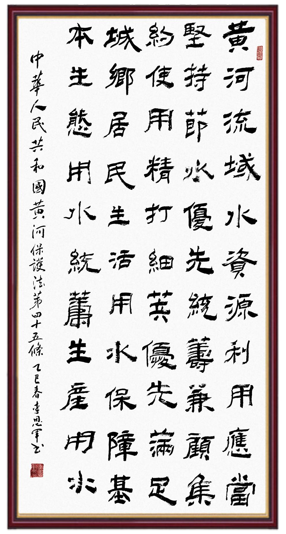 黃河寧,天下平。黃河是中華民族的發(fā)源地和搖籃,保護黃河是事關(guān)中華民族偉大復(fù)興的千秋大計。《中華人民共和國黃河保護法》為推進水資源節(jié)約集約利用、保護傳承弘揚黃河文化、推動黃河流域生態(tài)保護和高質(zhì)量發(fā)展提供了有力法治保障。繼書寫《中華人民共和國民法典》《中華人民共和國憲法》《中華人民共和國澳門特別行政區(qū)基本法》《中華人民共和國香港特別行政區(qū)基本法》《中華人民共和國國旗法》《中華人民共和國國徽法》《中華人民共和國國歌法》《中華人民共和國法官法》等法律法規(guī)之后,法制日報社聯(lián)合沿黃九?。▍^(qū))司法廳、書法家協(xié)會,將筆端對準(zhǔn)《中華人民共和國黃河保護法》。