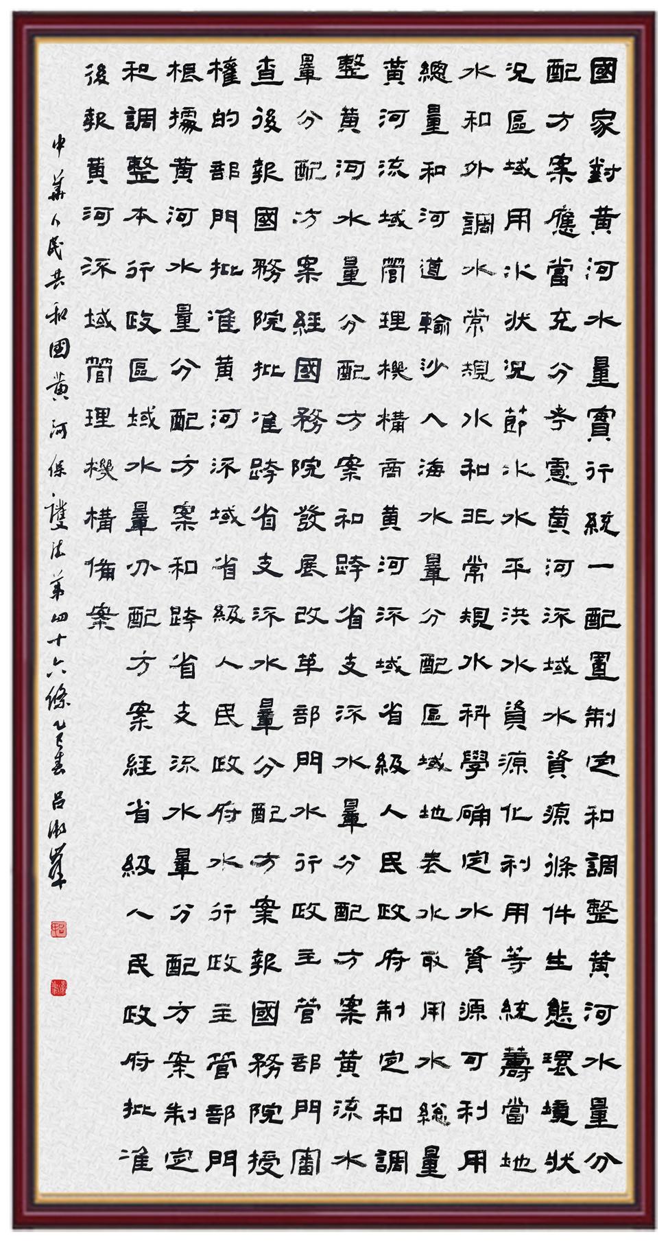黃河寧,天下平。黃河是中華民族的發(fā)源地和搖籃,保護黃河是事關(guān)中華民族偉大復興的千秋大計?!吨腥A人民共和國黃河保護法》為推進水資源節(jié)約集約利用、保護傳承弘揚黃河文化、推動黃河流域生態(tài)保護和高質(zhì)量發(fā)展提供了有力法治保障。繼書寫《中華人民共和國民法典》《中華人民共和國憲法》《中華人民共和國澳門特別行政區(qū)基本法》《中華人民共和國香港特別行政區(qū)基本法》《中華人民共和國國旗法》《中華人民共和國國徽法》《中華人民共和國國歌法》《中華人民共和國法官法》等法律法規(guī)之后,法制日報社聯(lián)合沿黃九?。▍^(qū))司法廳、書法家協(xié)會,將筆端對準《中華人民共和國黃河保護法》。