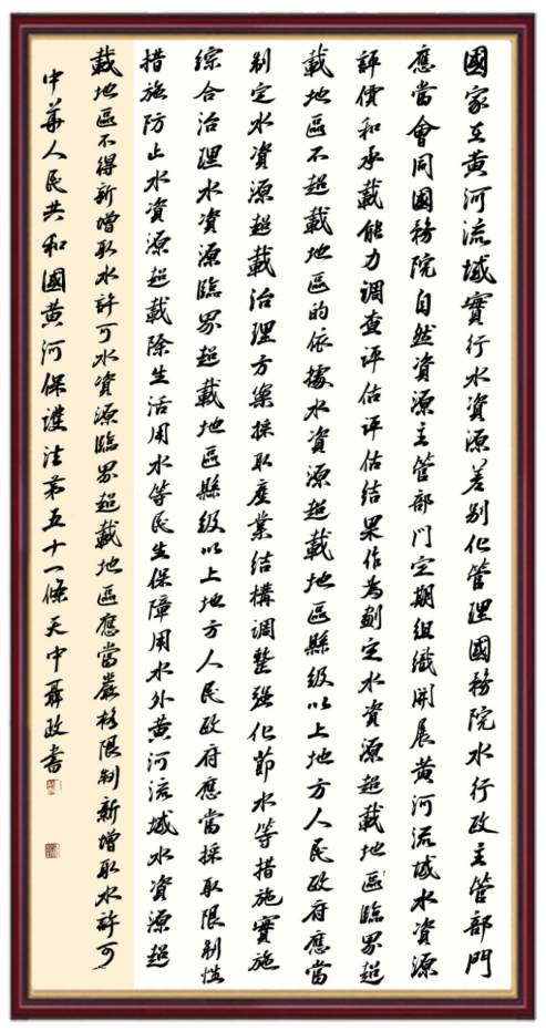 黃河寧,天下平。黃河是中華民族的發(fā)源地和搖籃,保護黃河是事關中華民族偉大復興的千秋大計?!吨腥A人民共和國黃河保護法》為推進水資源節(jié)約集約利用、保護傳承弘揚黃河文化、推動黃河流域生態(tài)保護和高質(zhì)量發(fā)展提供了有力法治保障。繼書寫《中華人民共和國民法典》《中華人民共和國憲法》《中華人民共和國澳門特別行政區(qū)基本法》《中華人民共和國香港特別行政區(qū)基本法》《中華人民共和國國旗法》《中華人民共和國國徽法》《中華人民共和國國歌法》《中華人民共和國法官法》等法律法規(guī)之后,法制日報社聯(lián)合沿黃九?。▍^(qū))司法廳、書法家協(xié)會,將筆端對準《中華人民共和國黃河保護法》。