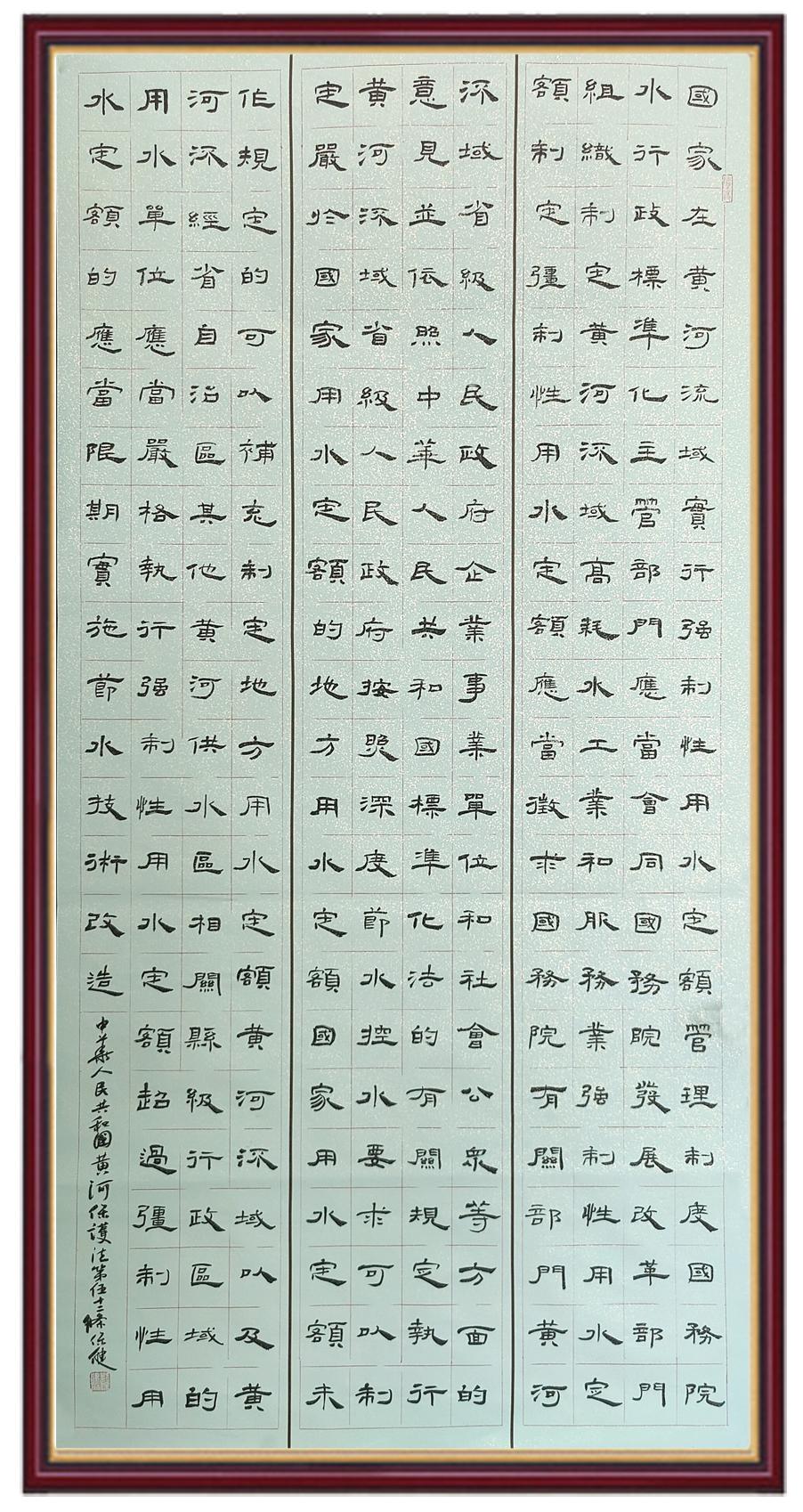 黃河寧,天下平。黃河是中華民族的發(fā)源地和搖籃,保護(hù)黃河是事關(guān)中華民族偉大復(fù)興的千秋大計(jì)?!吨腥A人民共和國黃河保護(hù)法》為推進(jìn)水資源節(jié)約集約利用、保護(hù)傳承弘揚(yáng)黃河文化、推動(dòng)黃河流域生態(tài)保護(hù)和高質(zhì)量發(fā)展提供了有力法治保障。繼書寫《中華人民共和國民法典》《中華人民共和國憲法》《中華人民共和國澳門特別行政區(qū)基本法》《中華人民共和國香港特別行政區(qū)基本法》《中華人民共和國國旗法》《中華人民共和國國徽法》《中華人民共和國國歌法》《中華人民共和國法官法》等法律法規(guī)之后,法制日報(bào)社聯(lián)合沿黃九省(區(qū))司法廳、書法家協(xié)會(huì),將筆端對準(zhǔn)《中華人民共和國黃河保護(hù)法》。
