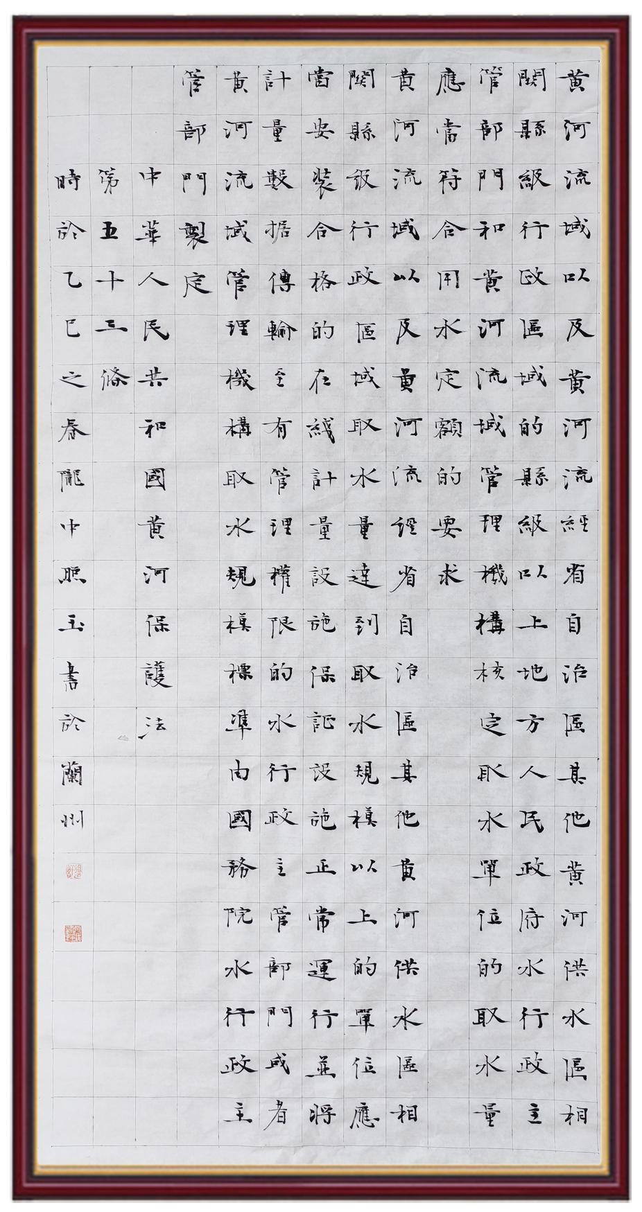 黃河寧,天下平。黃河是中華民族的發(fā)源地和搖籃,保護黃河是事關(guān)中華民族偉大復(fù)興的千秋大計?!吨腥A人民共和國黃河保護法》為推進水資源節(jié)約集約利用、保護傳承弘揚黃河文化、推動黃河流域生態(tài)保護和高質(zhì)量發(fā)展提供了有力法治保障。繼書寫《中華人民共和國民法典》《中華人民共和國憲法》《中華人民共和國澳門特別行政區(qū)基本法》《中華人民共和國香港特別行政區(qū)基本法》《中華人民共和國國旗法》《中華人民共和國國徽法》《中華人民共和國國歌法》《中華人民共和國法官法》等法律法規(guī)之后,法制日報社聯(lián)合沿黃九?。▍^(qū))司法廳、書法家協(xié)會,將筆端對準(zhǔn)《中華人民共和國黃河保護法》。