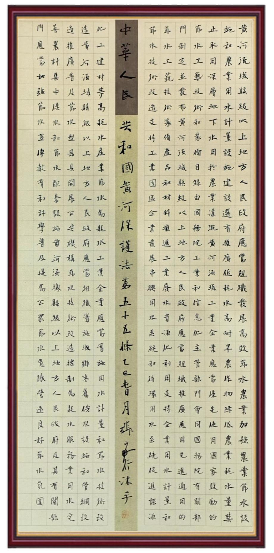 黃河寧,天下平。黃河是中華民族的發(fā)源地和搖籃,保護黃河是事關中華民族偉大復興的千秋大計。《中華人民共和國黃河保護法》為推進水資源節(jié)約集約利用、保護傳承弘揚黃河文化、推動黃河流域生態(tài)保護和高質量發(fā)展提供了有力法治保障。繼書寫《中華人民共和國民法典》《中華人民共和國憲法》《中華人民共和國澳門特別行政區(qū)基本法》《中華人民共和國香港特別行政區(qū)基本法》《中華人民共和國國旗法》《中華人民共和國國徽法》《中華人民共和國國歌法》《中華人民共和國法官法》等法律法規(guī)之后,法制日報社聯合沿黃九?。▍^(qū))司法廳、書法家協會,將筆端對準《中華人民共和國黃河保護法》。