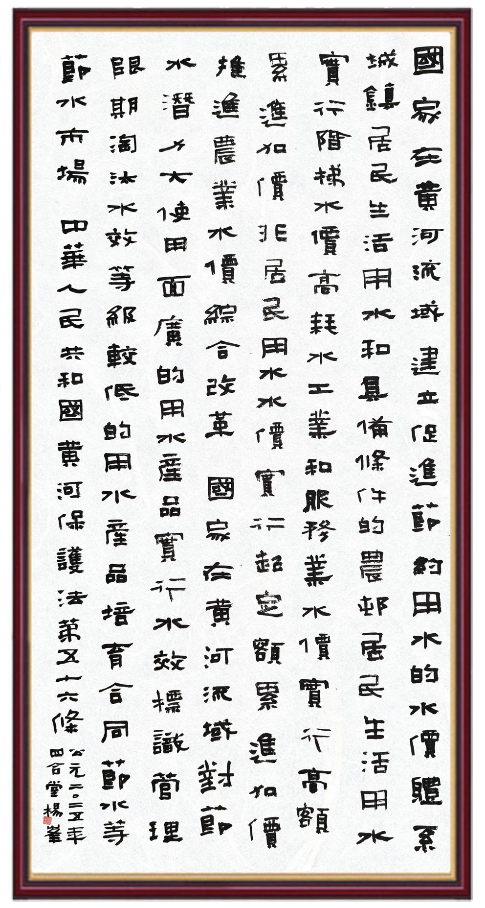 黃河寧,天下平。黃河是中華民族的發(fā)源地和搖籃,保護(hù)黃河是事關(guān)中華民族偉大復(fù)興的千秋大計(jì)?!吨腥A人民共和國(guó)黃河保護(hù)法》為推進(jìn)水資源節(jié)約集約利用、保護(hù)傳承弘揚(yáng)黃河文化、推動(dòng)黃河流域生態(tài)保護(hù)和高質(zhì)量發(fā)展提供了有力法治保障。繼書寫《中華人民共和國(guó)民法典》《中華人民共和國(guó)憲法》《中華人民共和國(guó)澳門特別行政區(qū)基本法》《中華人民共和國(guó)香港特別行政區(qū)基本法》《中華人民共和國(guó)國(guó)旗法》《中華人民共和國(guó)國(guó)徽法》《中華人民共和國(guó)國(guó)歌法》《中華人民共和國(guó)法官法》等法律法規(guī)之后,法制日?qǐng)?bào)社聯(lián)合沿黃九?。▍^(qū))司法廳、書法家協(xié)會(huì),將筆端對(duì)準(zhǔn)《中華人民共和國(guó)黃河保護(hù)法》。