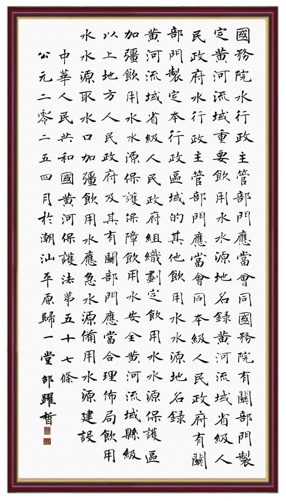 黃河寧,天下平。黃河是中華民族的發(fā)源地和搖籃,保護(hù)黃河是事關(guān)中華民族偉大復(fù)興的千秋大計(jì)?!吨腥A人民共和國(guó)黃河保護(hù)法》為推進(jìn)水資源節(jié)約集約利用、保護(hù)傳承弘揚(yáng)黃河文化、推動(dòng)黃河流域生態(tài)保護(hù)和高質(zhì)量發(fā)展提供了有力法治保障。繼書寫《中華人民共和國(guó)民法典》《中華人民共和國(guó)憲法》《中華人民共和國(guó)澳門特別行政區(qū)基本法》《中華人民共和國(guó)香港特別行政區(qū)基本法》《中華人民共和國(guó)國(guó)旗法》《中華人民共和國(guó)國(guó)徽法》《中華人民共和國(guó)國(guó)歌法》《中華人民共和國(guó)法官法》等法律法規(guī)之后,法制日?qǐng)?bào)社聯(lián)合沿黃九省(區(qū))司法廳、書法家協(xié)會(huì),將筆端對(duì)準(zhǔn)《中華人民共和國(guó)黃河保護(hù)法》。