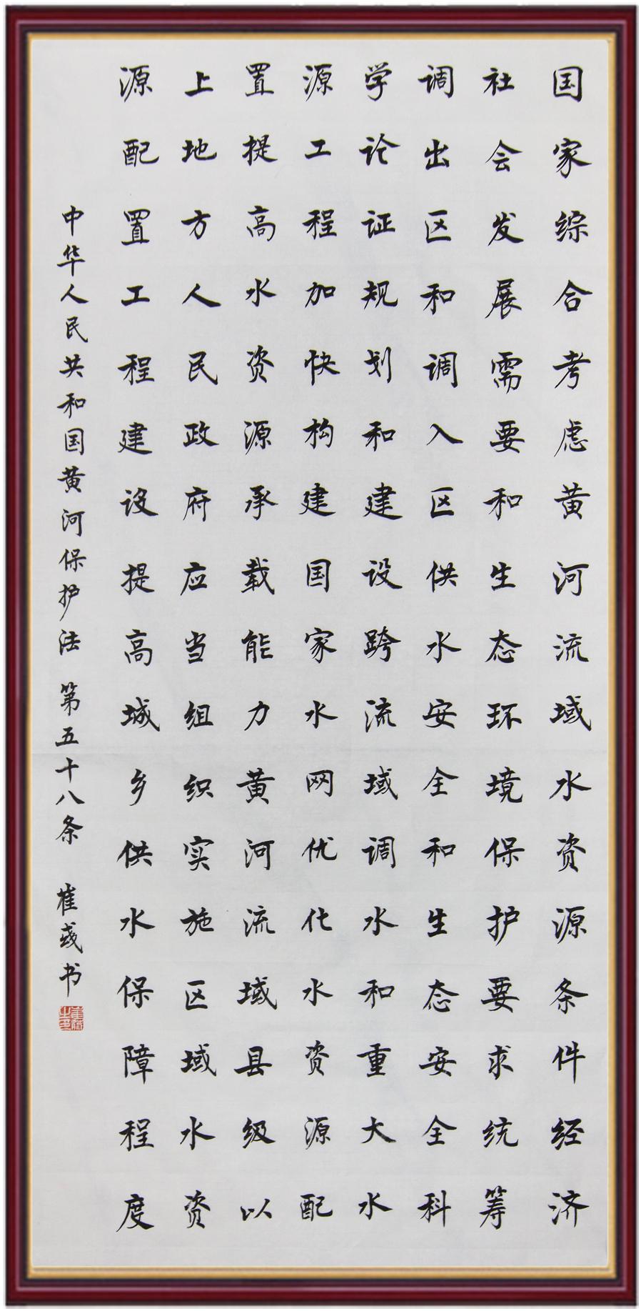 黃河寧,天下平。黃河是中華民族的發(fā)源地和搖籃,保護(hù)黃河是事關(guān)中華民族偉大復(fù)興的千秋大計(jì)?!吨腥A人民共和國(guó)黃河保護(hù)法》為推進(jìn)水資源節(jié)約集約利用、保護(hù)傳承弘揚(yáng)黃河文化、推動(dòng)黃河流域生態(tài)保護(hù)和高質(zhì)量發(fā)展提供了有力法治保障。繼書寫《中華人民共和國(guó)民法典》《中華人民共和國(guó)憲法》《中華人民共和國(guó)澳門特別行政區(qū)基本法》《中華人民共和國(guó)香港特別行政區(qū)基本法》《中華人民共和國(guó)國(guó)旗法》《中華人民共和國(guó)國(guó)徽法》《中華人民共和國(guó)國(guó)歌法》《中華人民共和國(guó)法官法》等法律法規(guī)之后,法制日?qǐng)?bào)社聯(lián)合沿黃九省(區(qū))司法廳、書法家協(xié)會(huì),將筆端對(duì)準(zhǔn)《中華人民共和國(guó)黃河保護(hù)法》。