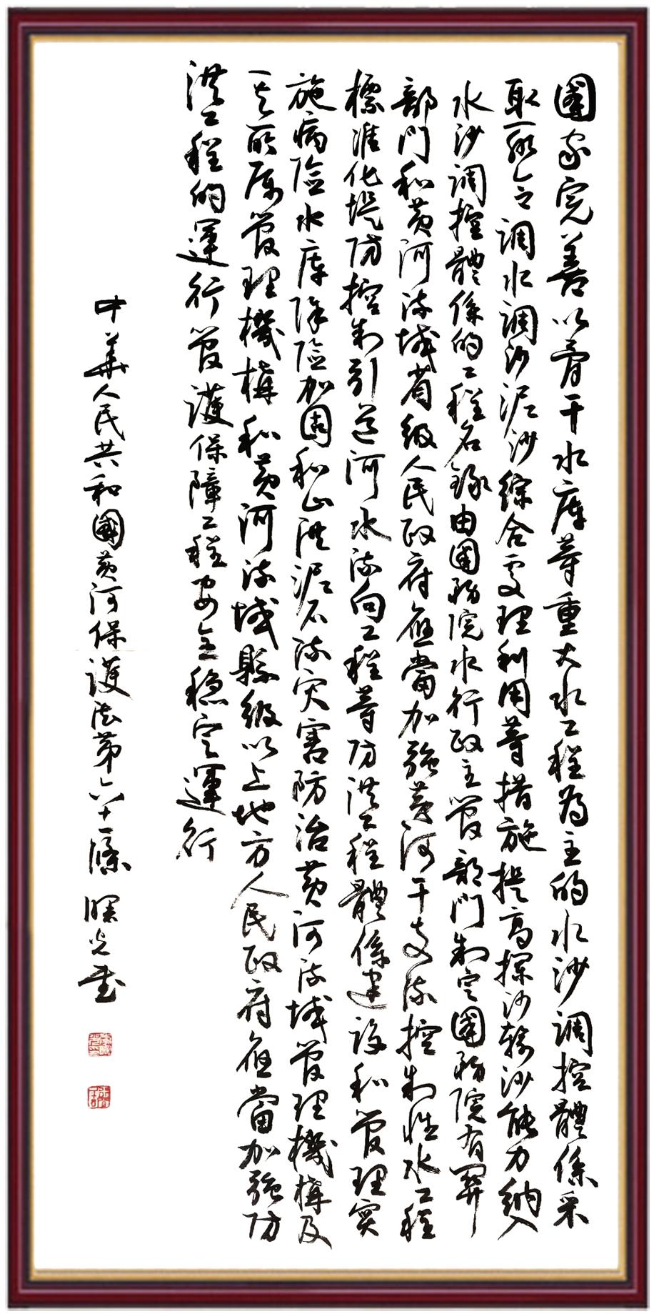 黃河寧,天下平。黃河是中華民族的發(fā)源地和搖籃,保護黃河是事關(guān)中華民族偉大復(fù)興的千秋大計?!吨腥A人民共和國黃河保護法》為推進水資源節(jié)約集約利用、保護傳承弘揚黃河文化、推動黃河流域生態(tài)保護和高質(zhì)量發(fā)展提供了有力法治保障。繼書寫《中華人民共和國民法典》《中華人民共和國憲法》《中華人民共和國澳門特別行政區(qū)基本法》《中華人民共和國香港特別行政區(qū)基本法》《中華人民共和國國旗法》《中華人民共和國國徽法》《中華人民共和國國歌法》《中華人民共和國法官法》等法律法規(guī)之后,法制日報社聯(lián)合沿黃九?。▍^(qū))司法廳、書法家協(xié)會,將筆端對準《中華人民共和國黃河保護法》。