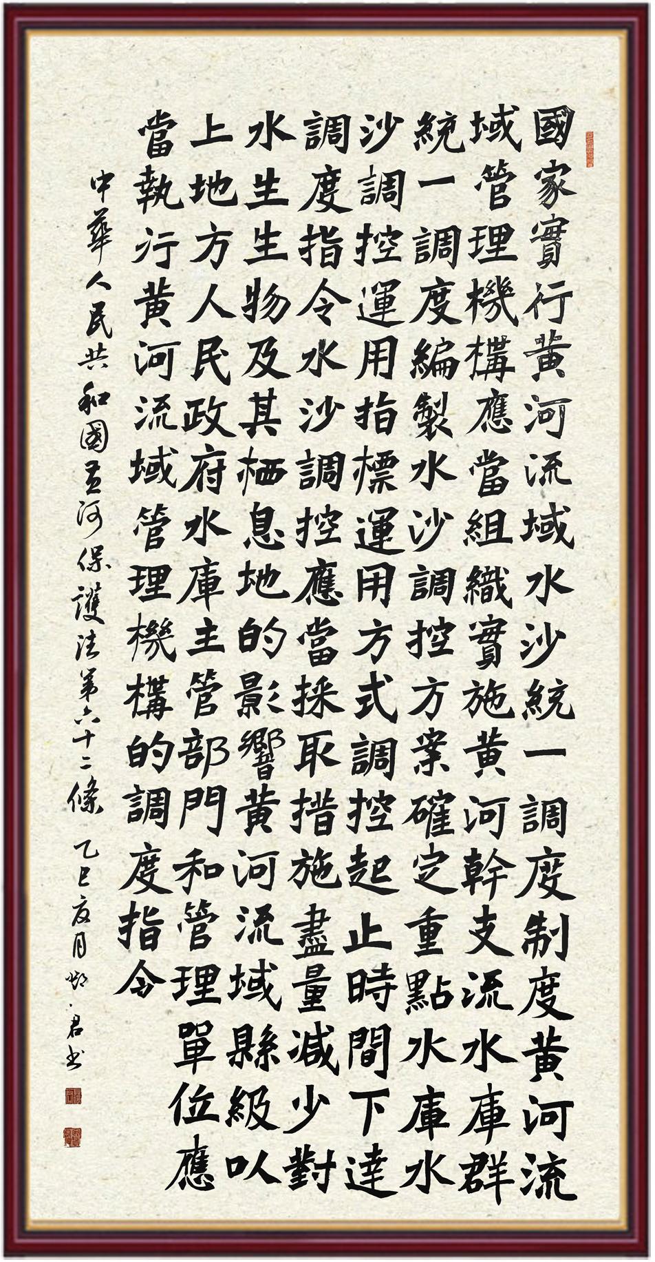 黃河寧,天下平。黃河是中華民族的發(fā)源地和搖籃,保護(hù)黃河是事關(guān)中華民族偉大復(fù)興的千秋大計?!吨腥A人民共和國黃河保護(hù)法》為推進(jìn)水資源節(jié)約集約利用、保護(hù)傳承弘揚(yáng)黃河文化、推動黃河流域生態(tài)保護(hù)和高質(zhì)量發(fā)展提供了有力法治保障。繼書寫《中華人民共和國民法典》《中華人民共和國憲法》《中華人民共和國澳門特別行政區(qū)基本法》《中華人民共和國香港特別行政區(qū)基本法》《中華人民共和國國旗法》《中華人民共和國國徽法》《中華人民共和國國歌法》《中華人民共和國法官法》等法律法規(guī)之后,法制日報社聯(lián)合沿黃九?。▍^(qū))司法廳、書法家協(xié)會,將筆端對準(zhǔn)《中華人民共和國黃河保護(hù)法》。