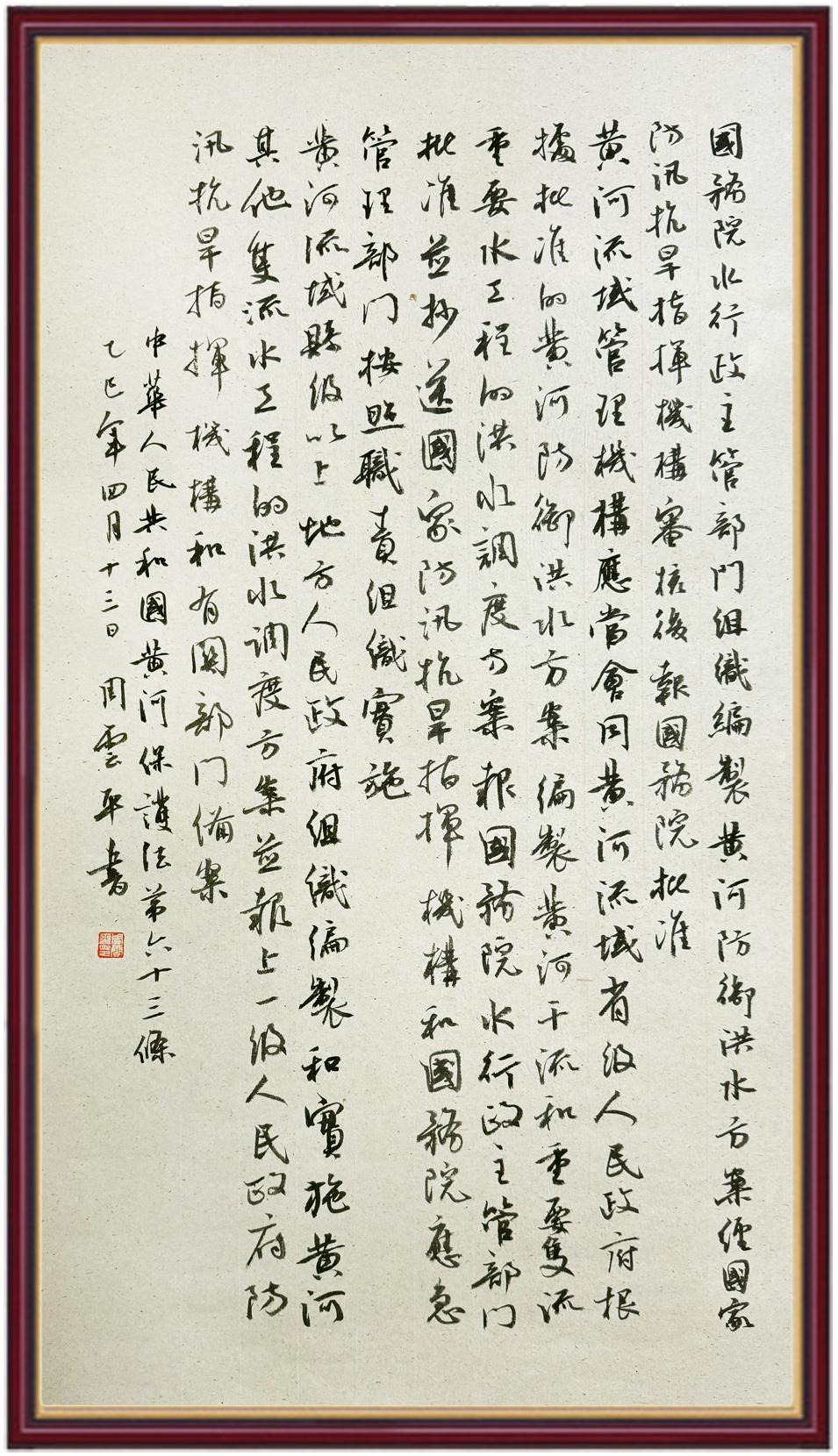 黃河寧,天下平。黃河是中華民族的發(fā)源地和搖籃,保護(hù)黃河是事關(guān)中華民族偉大復(fù)興的千秋大計(jì)?!吨腥A人民共和國黃河保護(hù)法》為推進(jìn)水資源節(jié)約集約利用、保護(hù)傳承弘揚(yáng)黃河文化、推動(dòng)黃河流域生態(tài)保護(hù)和高質(zhì)量發(fā)展提供了有力法治保障。繼書寫《中華人民共和國民法典》《中華人民共和國憲法》《中華人民共和國澳門特別行政區(qū)基本法》《中華人民共和國香港特別行政區(qū)基本法》《中華人民共和國國旗法》《中華人民共和國國徽法》《中華人民共和國國歌法》《中華人民共和國法官法》等法律法規(guī)之后,法制日報(bào)社聯(lián)合沿黃九?。▍^(qū))司法廳、書法家協(xié)會(huì),將筆端對準(zhǔn)《中華人民共和國黃河保護(hù)法》。
