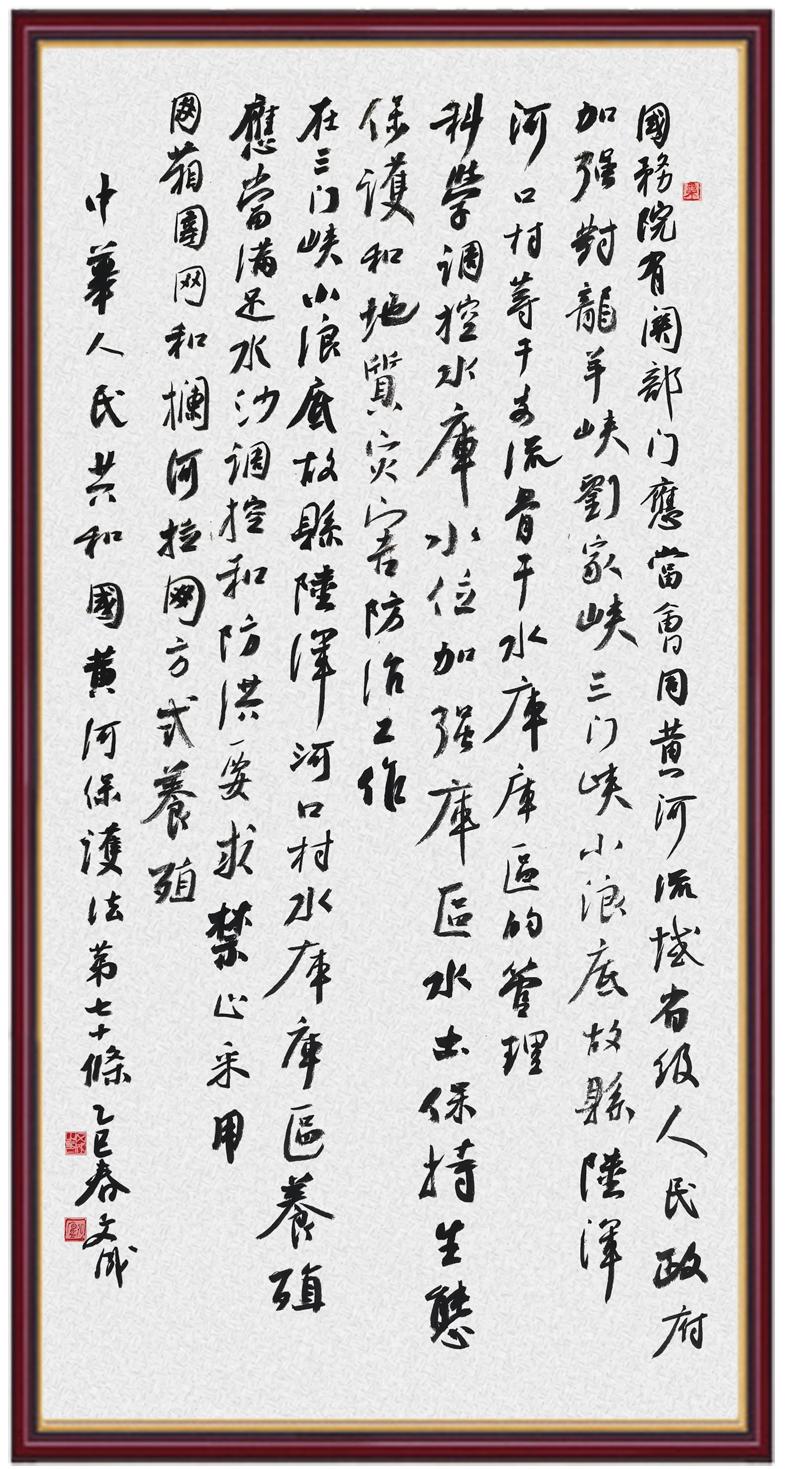 黃河寧,天下平。黃河是中華民族的發(fā)源地和搖籃,保護黃河是事關(guān)中華民族偉大復(fù)興的千秋大計?!吨腥A人民共和國黃河保護法》為推進水資源節(jié)約集約利用、保護傳承弘揚黃河文化、推動黃河流域生態(tài)保護和高質(zhì)量發(fā)展提供了有力法治保障。繼書寫《中華人民共和國民法典》《中華人民共和國憲法》《中華人民共和國澳門特別行政區(qū)基本法》《中華人民共和國香港特別行政區(qū)基本法》《中華人民共和國國旗法》《中華人民共和國國徽法》《中華人民共和國國歌法》《中華人民共和國法官法》等法律法規(guī)之后,法制日報社聯(lián)合沿黃九省(區(qū))司法廳、書法家協(xié)會,將筆端對準《中華人民共和國黃河保護法》。