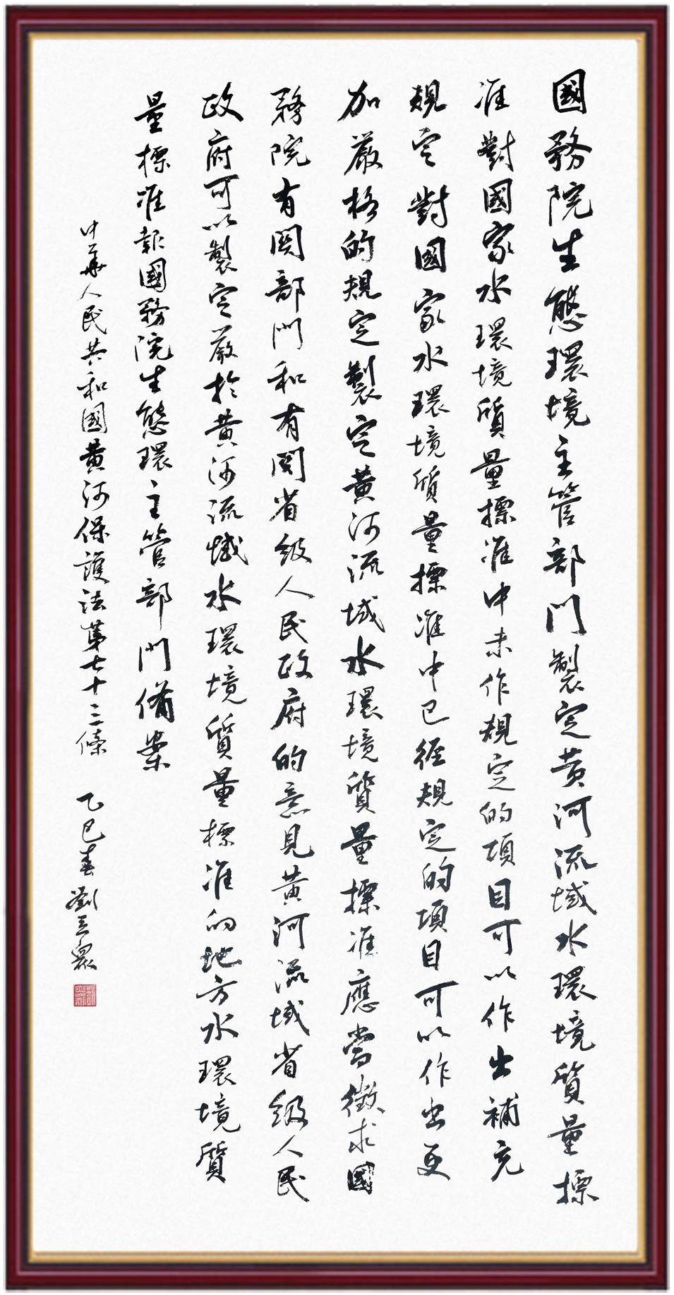 黃河寧,天下平。黃河是中華民族的發(fā)源地和搖籃,保護(hù)黃河是事關(guān)中華民族偉大復(fù)興的千秋大計(jì)?!吨腥A人民共和國(guó)黃河保護(hù)法》為推進(jìn)水資源節(jié)約集約利用、保護(hù)傳承弘揚(yáng)黃河文化、推動(dòng)黃河流域生態(tài)保護(hù)和高質(zhì)量發(fā)展提供了有力法治保障。繼書寫《中華人民共和國(guó)民法典》《中華人民共和國(guó)憲法》《中華人民共和國(guó)澳門特別行政區(qū)基本法》《中華人民共和國(guó)香港特別行政區(qū)基本法》《中華人民共和國(guó)國(guó)旗法》《中華人民共和國(guó)國(guó)徽法》《中華人民共和國(guó)國(guó)歌法》《中華人民共和國(guó)法官法》等法律法規(guī)之后,法制日?qǐng)?bào)社聯(lián)合沿黃九?。▍^(qū))司法廳、書法家協(xié)會(huì),將筆端對(duì)準(zhǔn)《中華人民共和國(guó)黃河保護(hù)法》。
