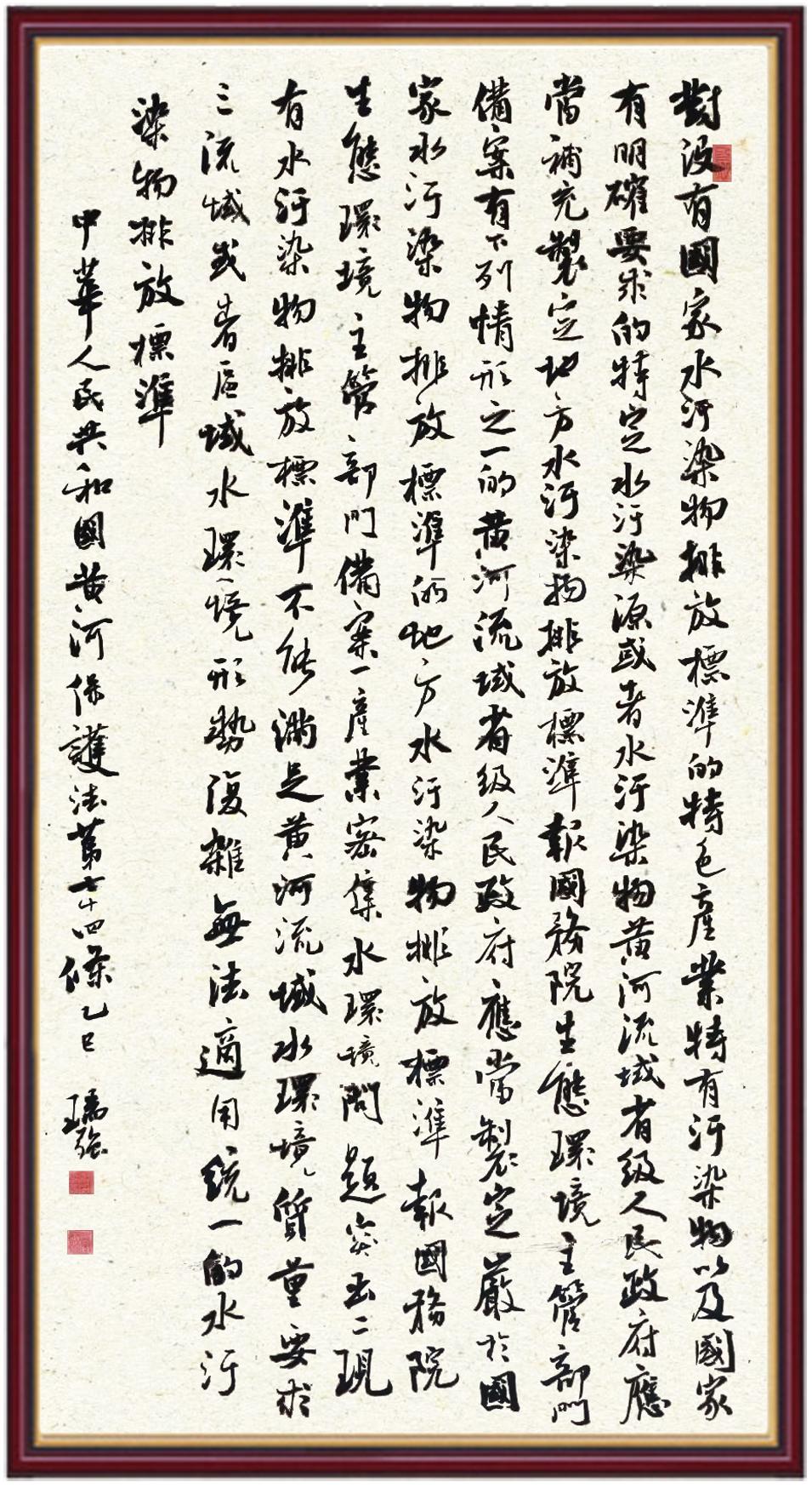 黃河寧,天下平。黃河是中華民族的發(fā)源地和搖籃,保護(hù)黃河是事關(guān)中華民族偉大復(fù)興的千秋大計?!吨腥A人民共和國黃河保護(hù)法》為推進(jìn)水資源節(jié)約集約利用、保護(hù)傳承弘揚(yáng)黃河文化、推動黃河流域生態(tài)保護(hù)和高質(zhì)量發(fā)展提供了有力法治保障。繼書寫《中華人民共和國民法典》《中華人民共和國憲法》《中華人民共和國澳門特別行政區(qū)基本法》《中華人民共和國香港特別行政區(qū)基本法》《中華人民共和國國旗法》《中華人民共和國國徽法》《中華人民共和國國歌法》《中華人民共和國法官法》等法律法規(guī)之后,法制日報社聯(lián)合沿黃九?。▍^(qū))司法廳、書法家協(xié)會,將筆端對準(zhǔn)《中華人民共和國黃河保護(hù)法》。
