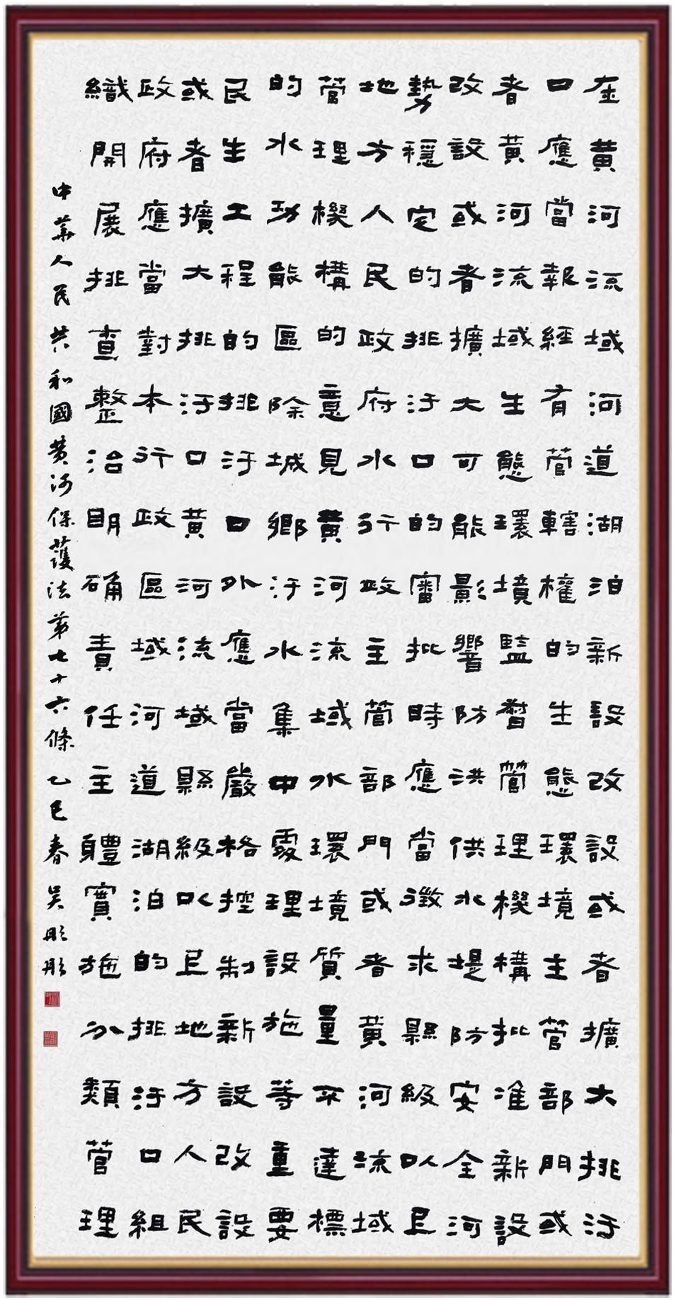 黃河寧,天下平。黃河是中華民族的發(fā)源地和搖籃,保護(hù)黃河是事關(guān)中華民族偉大復(fù)興的千秋大計(jì)?!吨腥A人民共和國(guó)黃河保護(hù)法》為推進(jìn)水資源節(jié)約集約利用、保護(hù)傳承弘揚(yáng)黃河文化、推動(dòng)黃河流域生態(tài)保護(hù)和高質(zhì)量發(fā)展提供了有力法治保障。繼書(shū)寫(xiě)《中華人民共和國(guó)民法典》《中華人民共和國(guó)憲法》《中華人民共和國(guó)澳門(mén)特別行政區(qū)基本法》《中華人民共和國(guó)香港特別行政區(qū)基本法》《中華人民共和國(guó)國(guó)旗法》《中華人民共和國(guó)國(guó)徽法》《中華人民共和國(guó)國(guó)歌法》《中華人民共和國(guó)法官法》等法律法規(guī)之后,法制日?qǐng)?bào)社聯(lián)合沿黃九?。▍^(qū))司法廳、書(shū)法家協(xié)會(huì),將筆端對(duì)準(zhǔn)《中華人民共和國(guó)黃河保護(hù)法》。