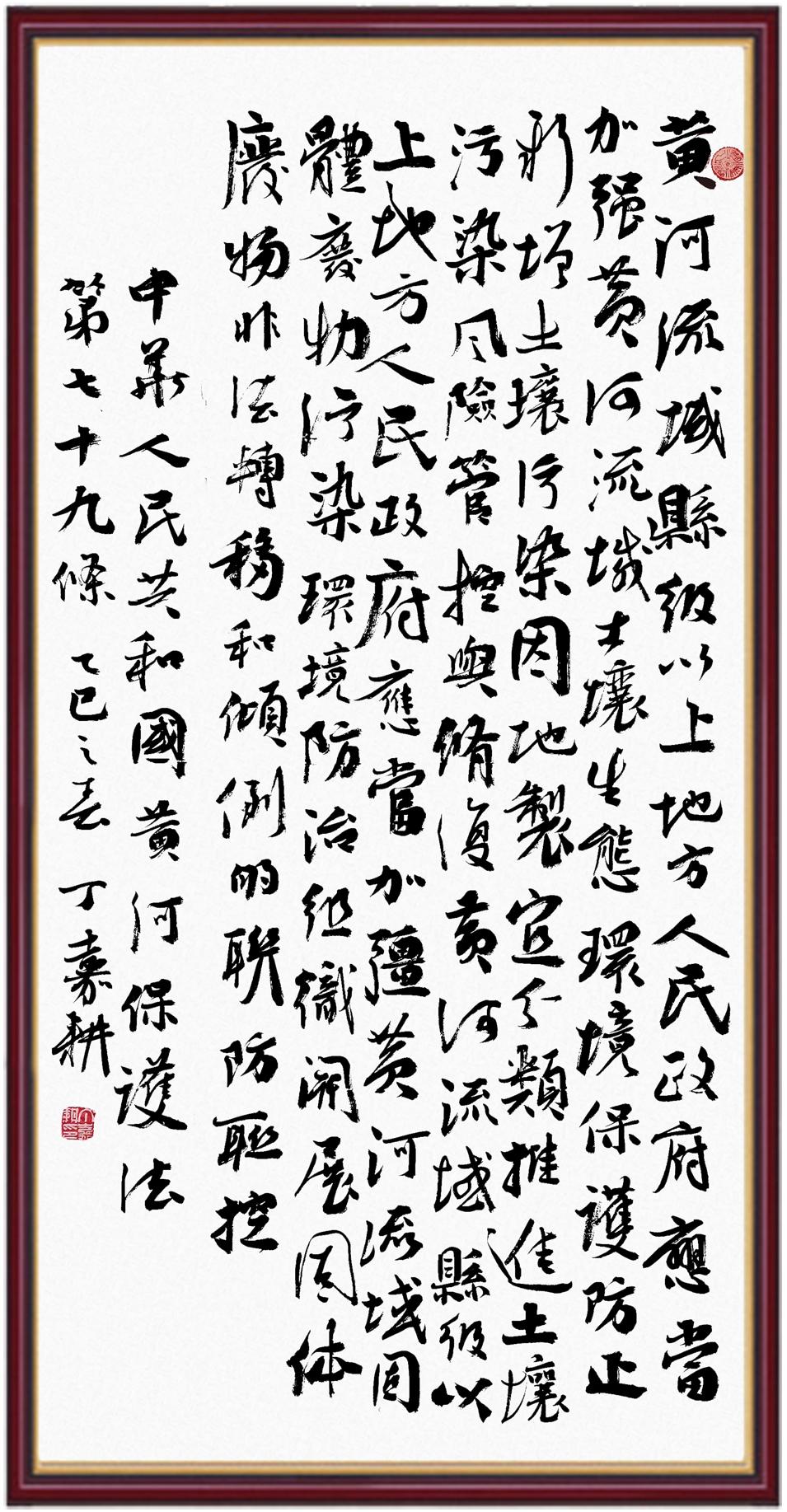 黃河寧,天下平。黃河是中華民族的發(fā)源地和搖籃,保護黃河是事關中華民族偉大復興的千秋大計?!吨腥A人民共和國黃河保護法》為推進水資源節(jié)約集約利用、保護傳承弘揚黃河文化、推動黃河流域生態(tài)保護和高質(zhì)量發(fā)展提供了有力法治保障。繼書寫《中華人民共和國民法典》《中華人民共和國憲法》《中華人民共和國澳門特別行政區(qū)基本法》《中華人民共和國香港特別行政區(qū)基本法》《中華人民共和國國旗法》《中華人民共和國國徽法》《中華人民共和國國歌法》《中華人民共和國法官法》等法律法規(guī)之后,法制日報社聯(lián)合沿黃九?。▍^(qū))司法廳、書法家協(xié)會,將筆端對準《中華人民共和國黃河保護法》。