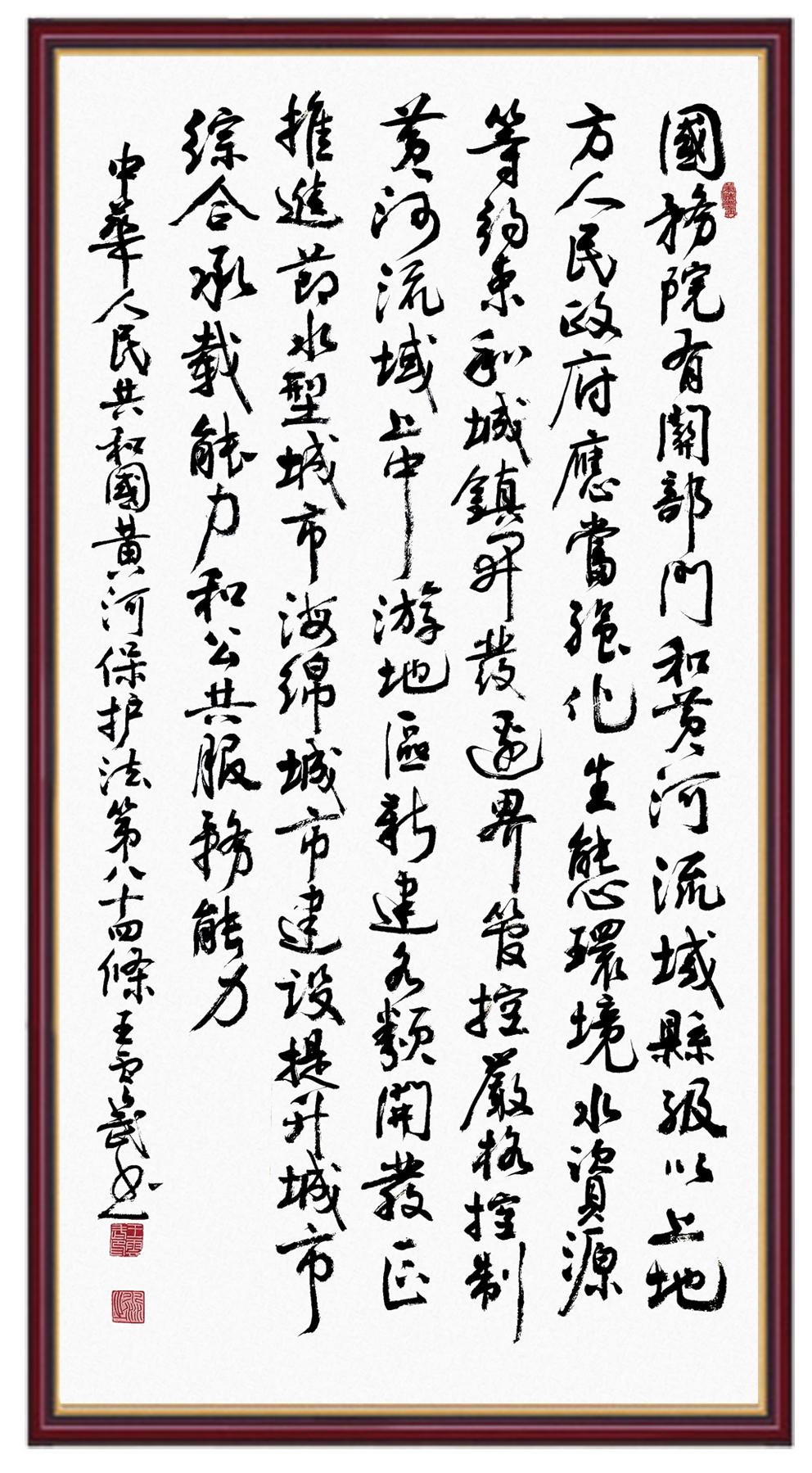 黃河寧,天下平。黃河是中華民族的發(fā)源地和搖籃,保護黃河是事關中華民族偉大復興的千秋大計。《中華人民共和國黃河保護法》為推進水資源節(jié)約集約利用、保護傳承弘揚黃河文化、推動黃河流域生態(tài)保護和高質量發(fā)展提供了有力法治保障。繼書寫《中華人民共和國民法典》《中華人民共和國憲法》《中華人民共和國澳門特別行政區(qū)基本法》《中華人民共和國香港特別行政區(qū)基本法》《中華人民共和國國旗法》《中華人民共和國國徽法》《中華人民共和國國歌法》《中華人民共和國法官法》等法律法規(guī)之后,法制日報社聯(lián)合沿黃九?。▍^(qū))司法廳、書法家協(xié)會,將筆端對準《中華人民共和國黃河保護法》。