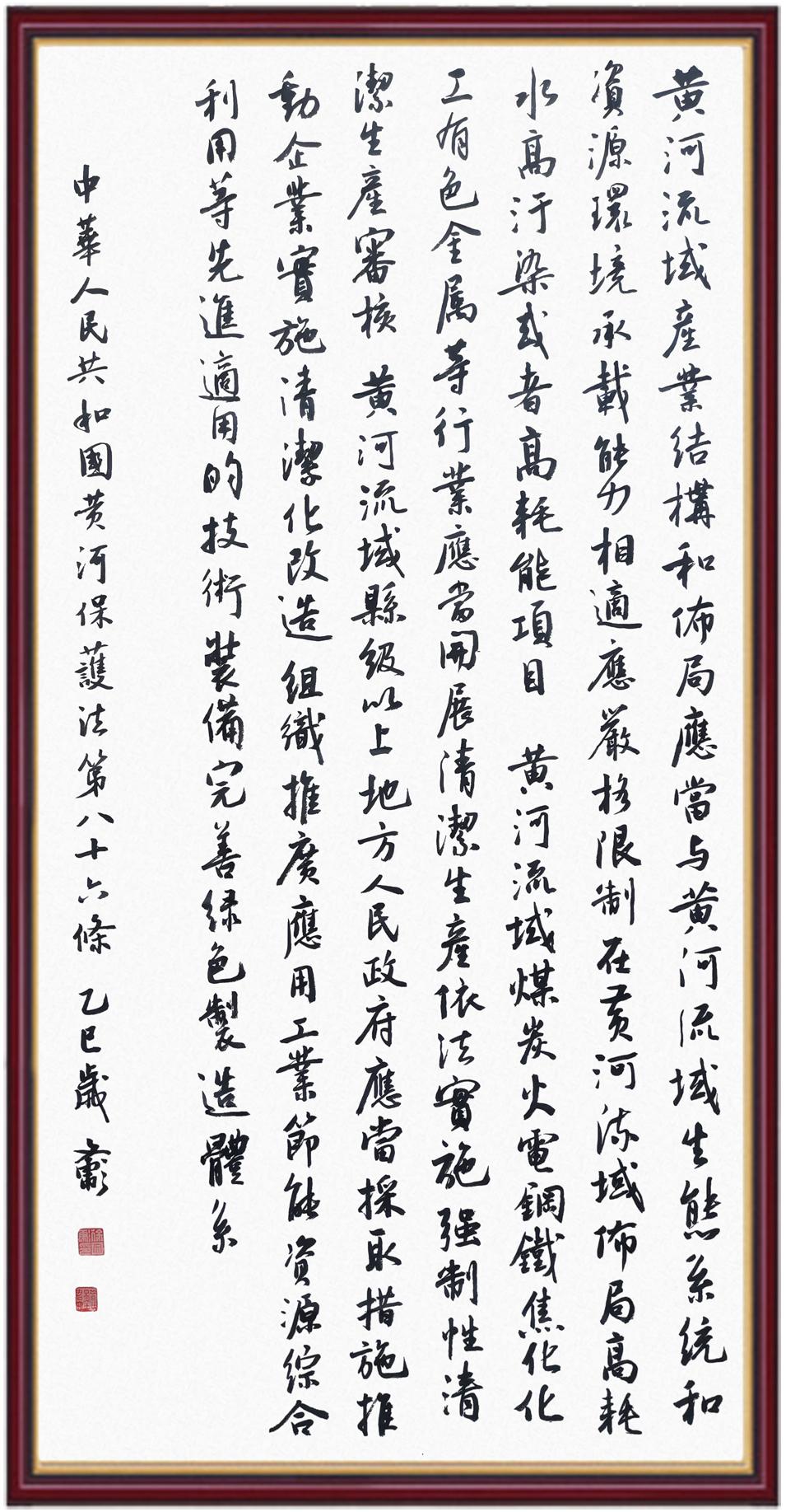 黃河寧,天下平。黃河是中華民族的發(fā)源地和搖籃,保護黃河是事關中華民族偉大復興的千秋大計。《中華人民共和國黃河保護法》為推進水資源節(jié)約集約利用、保護傳承弘揚黃河文化、推動黃河流域生態(tài)保護和高質量發(fā)展提供了有力法治保障。繼書寫《中華人民共和國民法典》《中華人民共和國憲法》《中華人民共和國澳門特別行政區(qū)基本法》《中華人民共和國香港特別行政區(qū)基本法》《中華人民共和國國旗法》《中華人民共和國國徽法》《中華人民共和國國歌法》《中華人民共和國法官法》等法律法規(guī)之后,法制日報社聯(lián)合沿黃九?。▍^(qū))司法廳、書法家協(xié)會,將筆端對準《中華人民共和國黃河保護法》。