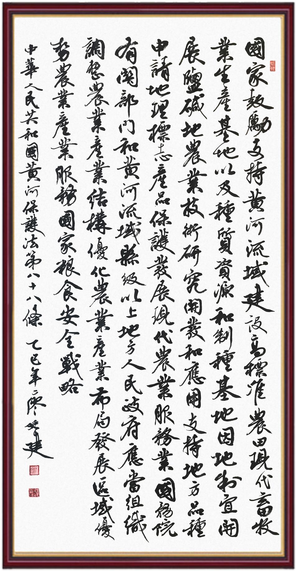 黃河寧,天下平。黃河是中華民族的發(fā)源地和搖籃,保護黃河是事關(guān)中華民族偉大復(fù)興的千秋大計?!吨腥A人民共和國黃河保護法》為推進水資源節(jié)約集約利用、保護傳承弘揚黃河文化、推動黃河流域生態(tài)保護和高質(zhì)量發(fā)展提供了有力法治保障。繼書寫《中華人民共和國民法典》《中華人民共和國憲法》《中華人民共和國澳門特別行政區(qū)基本法》《中華人民共和國香港特別行政區(qū)基本法》《中華人民共和國國旗法》《中華人民共和國國徽法》《中華人民共和國國歌法》《中華人民共和國法官法》等法律法規(guī)之后,法制日報社聯(lián)合沿黃九省(區(qū))司法廳、書法家協(xié)會,將筆端對準《中華人民共和國黃河保護法》。