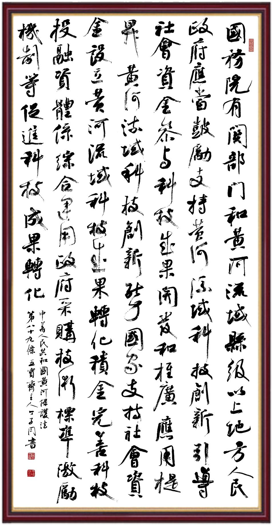 黃河寧,天下平。黃河是中華民族的發(fā)源地和搖籃,保護(hù)黃河是事關(guān)中華民族偉大復(fù)興的千秋大計(jì)?!吨腥A人民共和國(guó)黃河保護(hù)法》為推進(jìn)水資源節(jié)約集約利用、保護(hù)傳承弘揚(yáng)黃河文化、推動(dòng)黃河流域生態(tài)保護(hù)和高質(zhì)量發(fā)展提供了有力法治保障。繼書寫《中華人民共和國(guó)民法典》《中華人民共和國(guó)憲法》《中華人民共和國(guó)澳門特別行政區(qū)基本法》《中華人民共和國(guó)香港特別行政區(qū)基本法》《中華人民共和國(guó)國(guó)旗法》《中華人民共和國(guó)國(guó)徽法》《中華人民共和國(guó)國(guó)歌法》《中華人民共和國(guó)法官法》等法律法規(guī)之后,法制日?qǐng)?bào)社聯(lián)合沿黃九省(區(qū))司法廳、書法家協(xié)會(huì),將筆端對(duì)準(zhǔn)《中華人民共和國(guó)黃河保護(hù)法》。