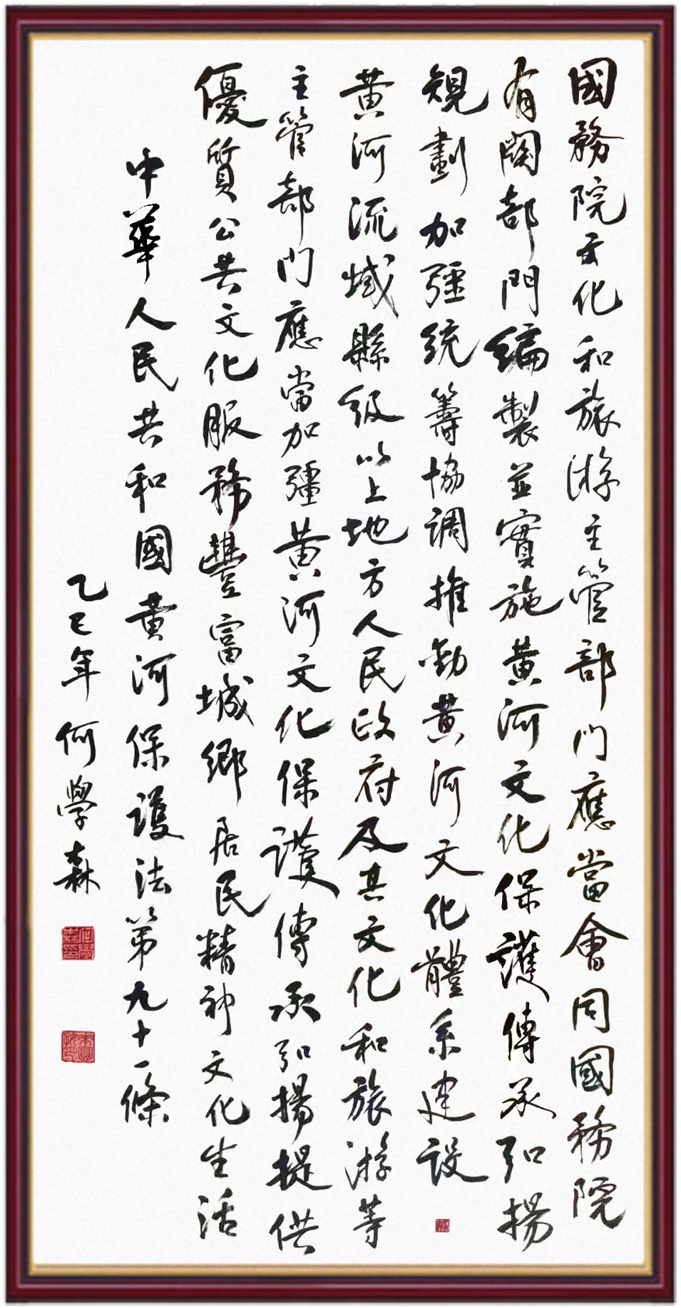 黃河寧,天下平。黃河是中華民族的發(fā)源地和搖籃,保護(hù)黃河是事關(guān)中華民族偉大復(fù)興的千秋大計(jì)?!吨腥A人民共和國(guó)黃河保護(hù)法》為推進(jìn)水資源節(jié)約集約利用、保護(hù)傳承弘揚(yáng)黃河文化、推動(dòng)黃河流域生態(tài)保護(hù)和高質(zhì)量發(fā)展提供了有力法治保障。繼書寫《中華人民共和國(guó)民法典》《中華人民共和國(guó)憲法》《中華人民共和國(guó)澳門特別行政區(qū)基本法》《中華人民共和國(guó)香港特別行政區(qū)基本法》《中華人民共和國(guó)國(guó)旗法》《中華人民共和國(guó)國(guó)徽法》《中華人民共和國(guó)國(guó)歌法》《中華人民共和國(guó)法官法》等法律法規(guī)之后,法制日?qǐng)?bào)社聯(lián)合沿黃九?。▍^(qū))司法廳、書法家協(xié)會(huì),將筆端對(duì)準(zhǔn)《中華人民共和國(guó)黃河保護(hù)法》。