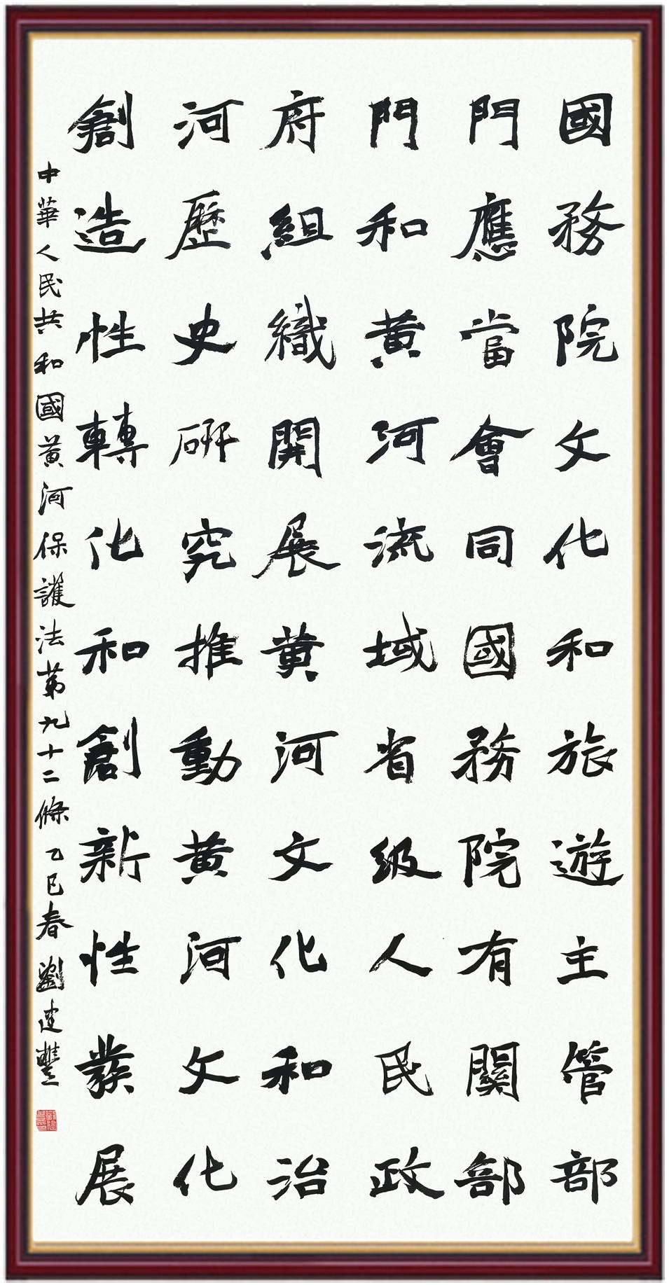 黃河寧,天下平。黃河是中華民族的發(fā)源地和搖籃,保護(hù)黃河是事關(guān)中華民族偉大復(fù)興的千秋大計(jì)?!吨腥A人民共和國(guó)黃河保護(hù)法》為推進(jìn)水資源節(jié)約集約利用、保護(hù)傳承弘揚(yáng)黃河文化、推動(dòng)黃河流域生態(tài)保護(hù)和高質(zhì)量發(fā)展提供了有力法治保障。繼書寫《中華人民共和國(guó)民法典》《中華人民共和國(guó)憲法》《中華人民共和國(guó)澳門特別行政區(qū)基本法》《中華人民共和國(guó)香港特別行政區(qū)基本法》《中華人民共和國(guó)國(guó)旗法》《中華人民共和國(guó)國(guó)徽法》《中華人民共和國(guó)國(guó)歌法》《中華人民共和國(guó)法官法》等法律法規(guī)之后,法制日?qǐng)?bào)社聯(lián)合沿黃九?。▍^(qū))司法廳、書法家協(xié)會(huì),將筆端對(duì)準(zhǔn)《中華人民共和國(guó)黃河保護(hù)法》。
