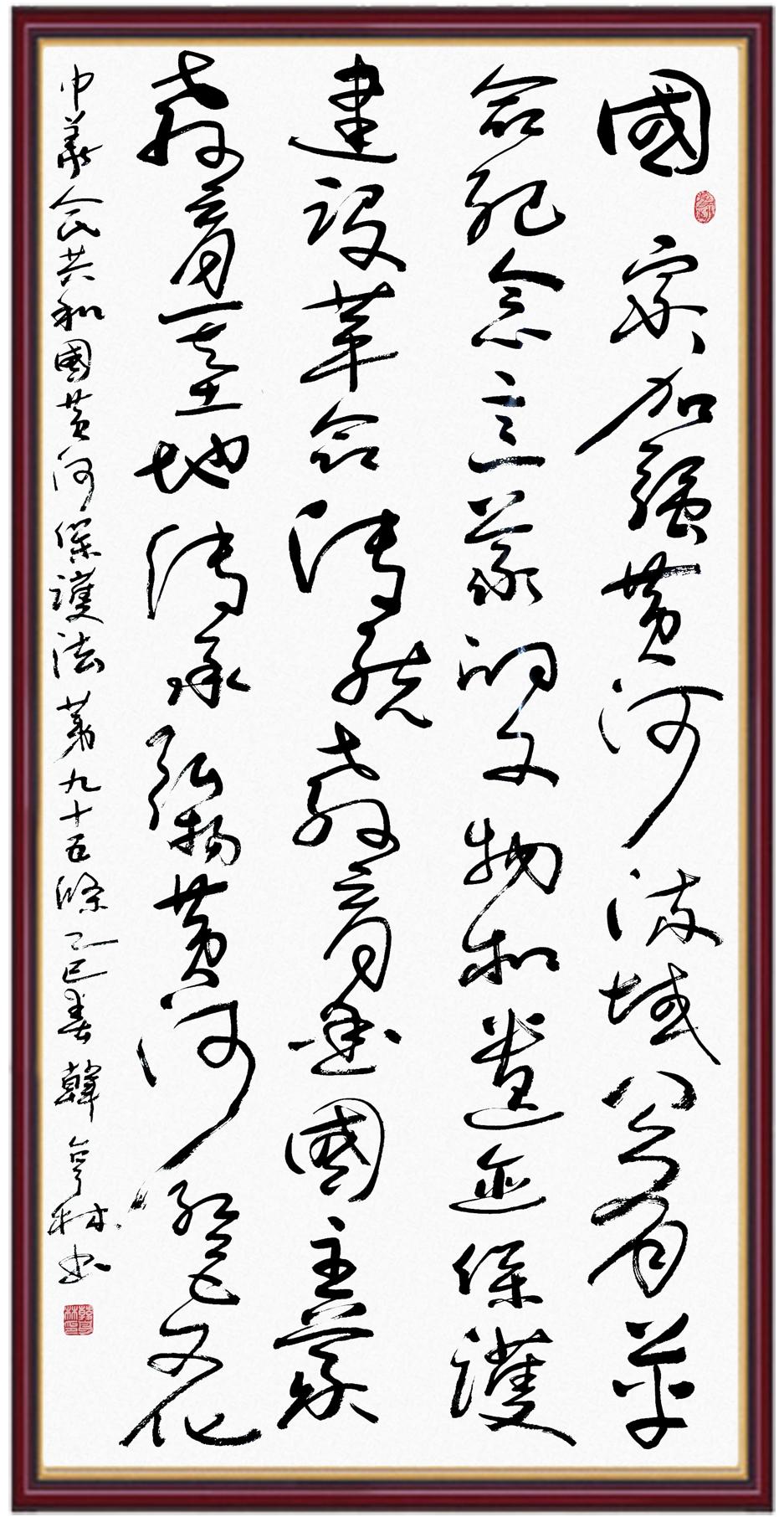 黃河寧,天下平。黃河是中華民族的發(fā)源地和搖籃,保護(hù)黃河是事關(guān)中華民族偉大復(fù)興的千秋大計?!吨腥A人民共和國黃河保護(hù)法》為推進(jìn)水資源節(jié)約集約利用、保護(hù)傳承弘揚黃河文化、推動黃河流域生態(tài)保護(hù)和高質(zhì)量發(fā)展提供了有力法治保障。繼書寫《中華人民共和國民法典》《中華人民共和國憲法》《中華人民共和國澳門特別行政區(qū)基本法》《中華人民共和國香港特別行政區(qū)基本法》《中華人民共和國國旗法》《中華人民共和國國徽法》《中華人民共和國國歌法》《中華人民共和國法官法》等法律法規(guī)之后,法制日報社聯(lián)合沿黃九?。▍^(qū))司法廳、書法家協(xié)會,將筆端對準(zhǔn)《中華人民共和國黃河保護(hù)法》。