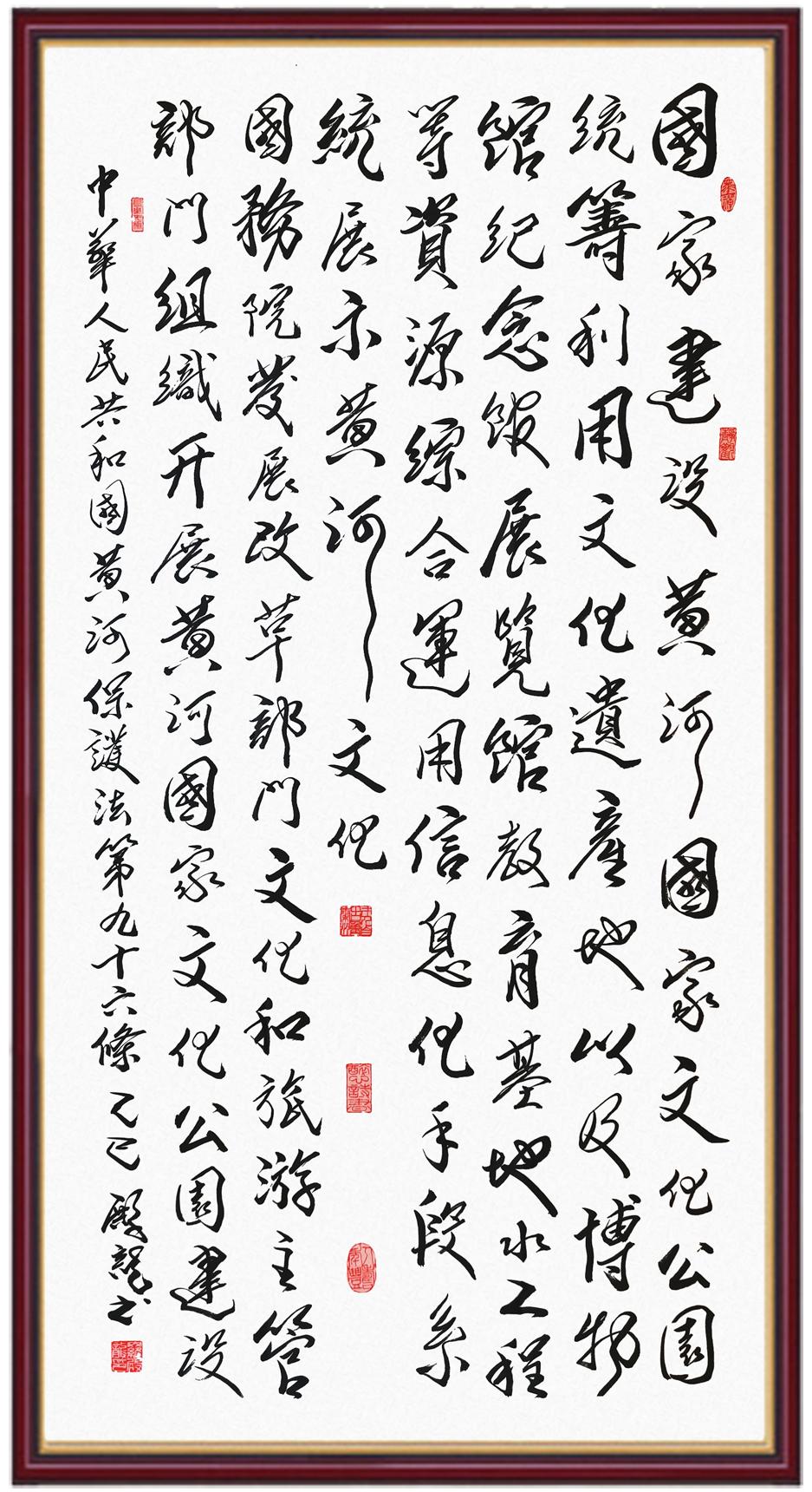 黃河寧,天下平。黃河是中華民族的發(fā)源地和搖籃,保護(hù)黃河是事關(guān)中華民族偉大復(fù)興的千秋大計(jì)?!吨腥A人民共和國(guó)黃河保護(hù)法》為推進(jìn)水資源節(jié)約集約利用、保護(hù)傳承弘揚(yáng)黃河文化、推動(dòng)黃河流域生態(tài)保護(hù)和高質(zhì)量發(fā)展提供了有力法治保障。繼書寫《中華人民共和國(guó)民法典》《中華人民共和國(guó)憲法》《中華人民共和國(guó)澳門特別行政區(qū)基本法》《中華人民共和國(guó)香港特別行政區(qū)基本法》《中華人民共和國(guó)國(guó)旗法》《中華人民共和國(guó)國(guó)徽法》《中華人民共和國(guó)國(guó)歌法》《中華人民共和國(guó)法官法》等法律法規(guī)之后,法制日?qǐng)?bào)社聯(lián)合沿黃九?。▍^(qū))司法廳、書法家協(xié)會(huì),將筆端對(duì)準(zhǔn)《中華人民共和國(guó)黃河保護(hù)法》。