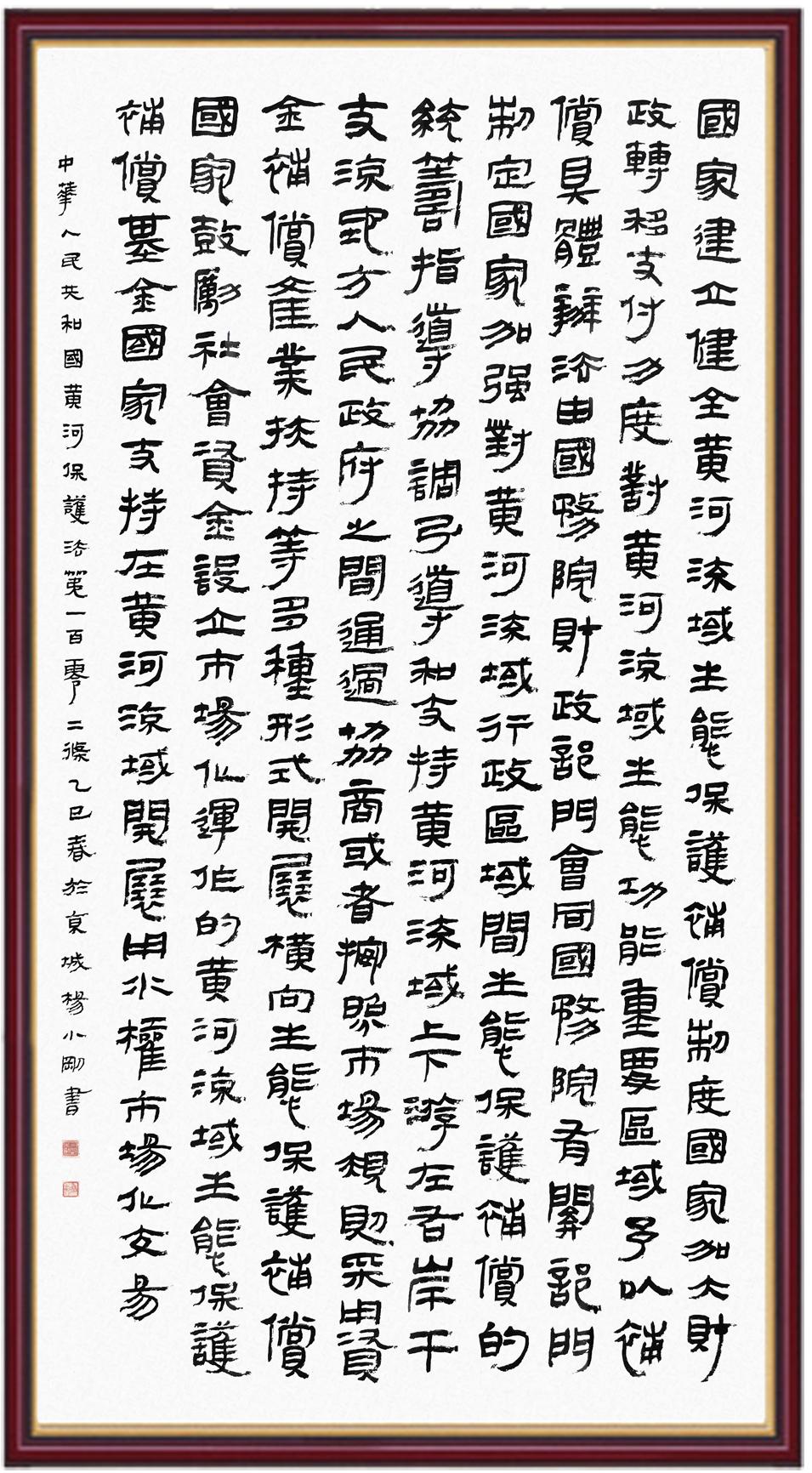 黃河寧,天下平。黃河是中華民族的發(fā)源地和搖籃,保護黃河是事關中華民族偉大復興的千秋大計?!吨腥A人民共和國黃河保護法》為推進水資源節(jié)約集約利用、保護傳承弘揚黃河文化、推動黃河流域生態(tài)保護和高質(zhì)量發(fā)展提供了有力法治保障。繼書寫《中華人民共和國民法典》《中華人民共和國憲法》《中華人民共和國澳門特別行政區(qū)基本法》《中華人民共和國香港特別行政區(qū)基本法》《中華人民共和國國旗法》《中華人民共和國國徽法》《中華人民共和國國歌法》《中華人民共和國法官法》等法律法規(guī)之后,法制日報社聯(lián)合沿黃九?。▍^(qū))司法廳、書法家協(xié)會,將筆端對準《中華人民共和國黃河保護法》。