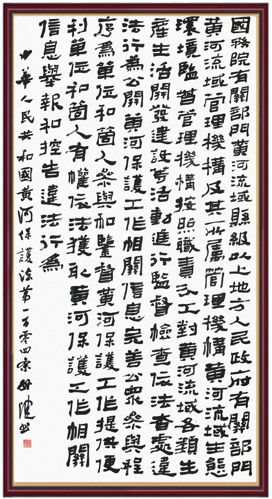 黃河寧,天下平。黃河是中華民族的發(fā)源地和搖籃,保護(hù)黃河是事關(guān)中華民族偉大復(fù)興的千秋大計(jì)。《中華人民共和國(guó)黃河保護(hù)法》為推進(jìn)水資源節(jié)約集約利用、保護(hù)傳承弘揚(yáng)黃河文化、推動(dòng)黃河流域生態(tài)保護(hù)和高質(zhì)量發(fā)展提供了有力法治保障。繼書寫《中華人民共和國(guó)民法典》《中華人民共和國(guó)憲法》《中華人民共和國(guó)澳門特別行政區(qū)基本法》《中華人民共和國(guó)香港特別行政區(qū)基本法》《中華人民共和國(guó)國(guó)旗法》《中華人民共和國(guó)國(guó)徽法》《中華人民共和國(guó)國(guó)歌法》《中華人民共和國(guó)法官法》等法律法規(guī)之后,法制日?qǐng)?bào)社聯(lián)合沿黃九?。▍^(qū))司法廳、書法家協(xié)會(huì),將筆端對(duì)準(zhǔn)《中華人民共和國(guó)黃河保護(hù)法》。