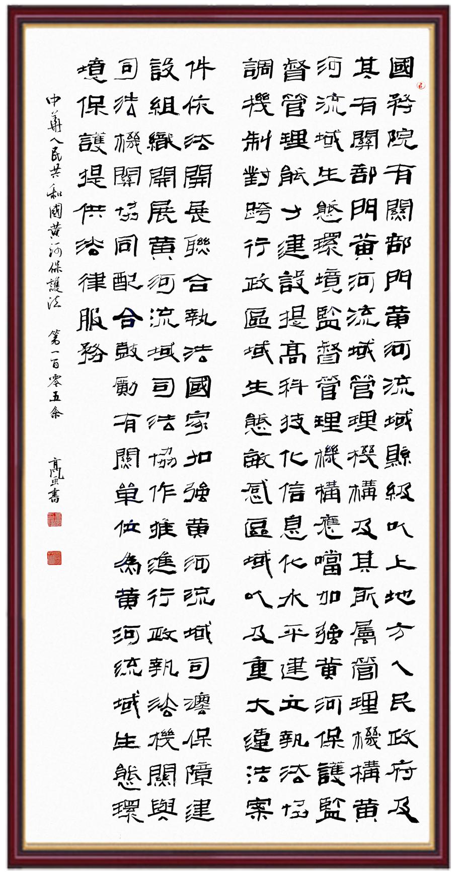 黃河寧,天下平。黃河是中華民族的發(fā)源地和搖籃,保護(hù)黃河是事關(guān)中華民族偉大復(fù)興的千秋大計?!吨腥A人民共和國黃河保護(hù)法》為推進(jìn)水資源節(jié)約集約利用、保護(hù)傳承弘揚黃河文化、推動黃河流域生態(tài)保護(hù)和高質(zhì)量發(fā)展提供了有力法治保障。繼書寫《中華人民共和國民法典》《中華人民共和國憲法》《中華人民共和國澳門特別行政區(qū)基本法》《中華人民共和國香港特別行政區(qū)基本法》《中華人民共和國國旗法》《中華人民共和國國徽法》《中華人民共和國國歌法》《中華人民共和國法官法》等法律法規(guī)之后,法制日報社聯(lián)合沿黃九?。▍^(qū))司法廳、書法家協(xié)會,將筆端對準(zhǔn)《中華人民共和國黃河保護(hù)法》。
