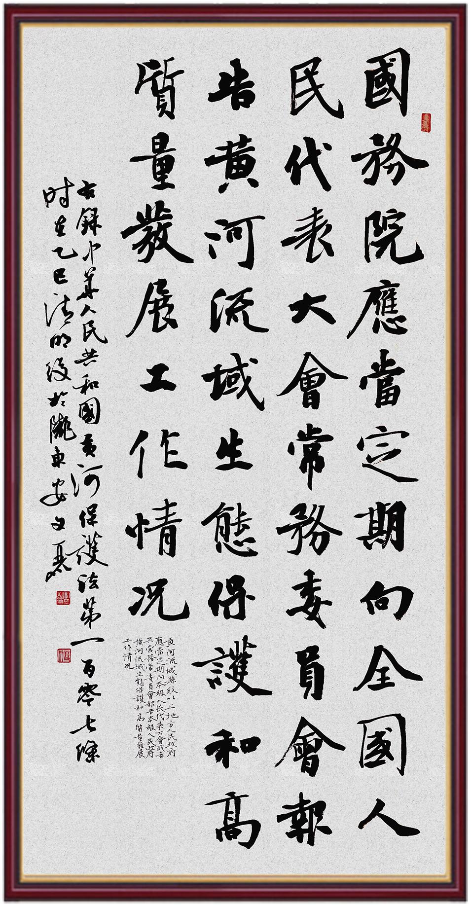 黃河寧,天下平。黃河是中華民族的發(fā)源地和搖籃,保護(hù)黃河是事關(guān)中華民族偉大復(fù)興的千秋大計(jì)。《中華人民共和國(guó)黃河保護(hù)法》為推進(jìn)水資源節(jié)約集約利用、保護(hù)傳承弘揚(yáng)黃河文化、推動(dòng)黃河流域生態(tài)保護(hù)和高質(zhì)量發(fā)展提供了有力法治保障。繼書寫《中華人民共和國(guó)民法典》《中華人民共和國(guó)憲法》《中華人民共和國(guó)澳門特別行政區(qū)基本法》《中華人民共和國(guó)香港特別行政區(qū)基本法》《中華人民共和國(guó)國(guó)旗法》《中華人民共和國(guó)國(guó)徽法》《中華人民共和國(guó)國(guó)歌法》《中華人民共和國(guó)法官法》等法律法規(guī)之后,法制日?qǐng)?bào)社聯(lián)合沿黃九省(區(qū))司法廳、書法家協(xié)會(huì),將筆端對(duì)準(zhǔn)《中華人民共和國(guó)黃河保護(hù)法》。