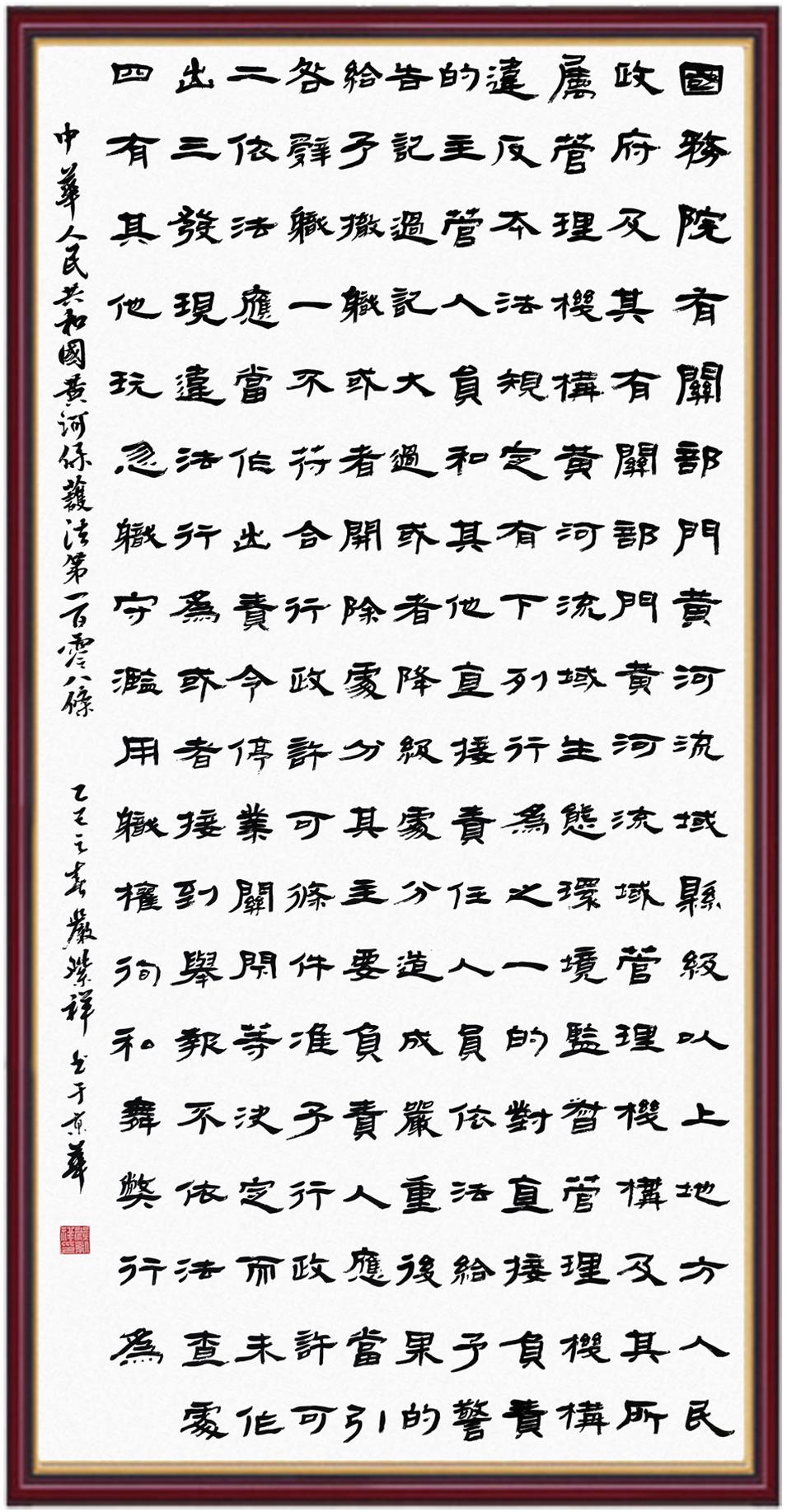 黃河寧,天下平。黃河是中華民族的發(fā)源地和搖籃,保護黃河是事關(guān)中華民族偉大復(fù)興的千秋大計。《中華人民共和國黃河保護法》為推進水資源節(jié)約集約利用、保護傳承弘揚黃河文化、推動黃河流域生態(tài)保護和高質(zhì)量發(fā)展提供了有力法治保障。繼書寫《中華人民共和國民法典》《中華人民共和國憲法》《中華人民共和國澳門特別行政區(qū)基本法》《中華人民共和國香港特別行政區(qū)基本法》《中華人民共和國國旗法》《中華人民共和國國徽法》《中華人民共和國國歌法》《中華人民共和國法官法》等法律法規(guī)之后,法制日報社聯(lián)合沿黃九?。▍^(qū))司法廳、書法家協(xié)會,將筆端對準(zhǔn)《中華人民共和國黃河保護法》。