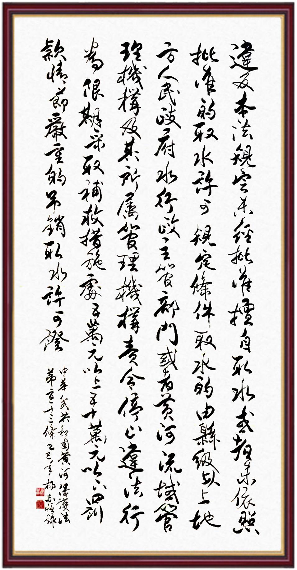 黃河寧,天下平。黃河是中華民族的發(fā)源地和搖籃,保護(hù)黃河是事關(guān)中華民族偉大復(fù)興的千秋大計?!吨腥A人民共和國黃河保護(hù)法》為推進(jìn)水資源節(jié)約集約利用、保護(hù)傳承弘揚(yáng)黃河文化、推動黃河流域生態(tài)保護(hù)和高質(zhì)量發(fā)展提供了有力法治保障。繼書寫《中華人民共和國民法典》《中華人民共和國憲法》《中華人民共和國澳門特別行政區(qū)基本法》《中華人民共和國香港特別行政區(qū)基本法》《中華人民共和國國旗法》《中華人民共和國國徽法》《中華人民共和國國歌法》《中華人民共和國法官法》等法律法規(guī)之后,法制日報社聯(lián)合沿黃九省(區(qū))司法廳、書法家協(xié)會,將筆端對準(zhǔn)《中華人民共和國黃河保護(hù)法》。