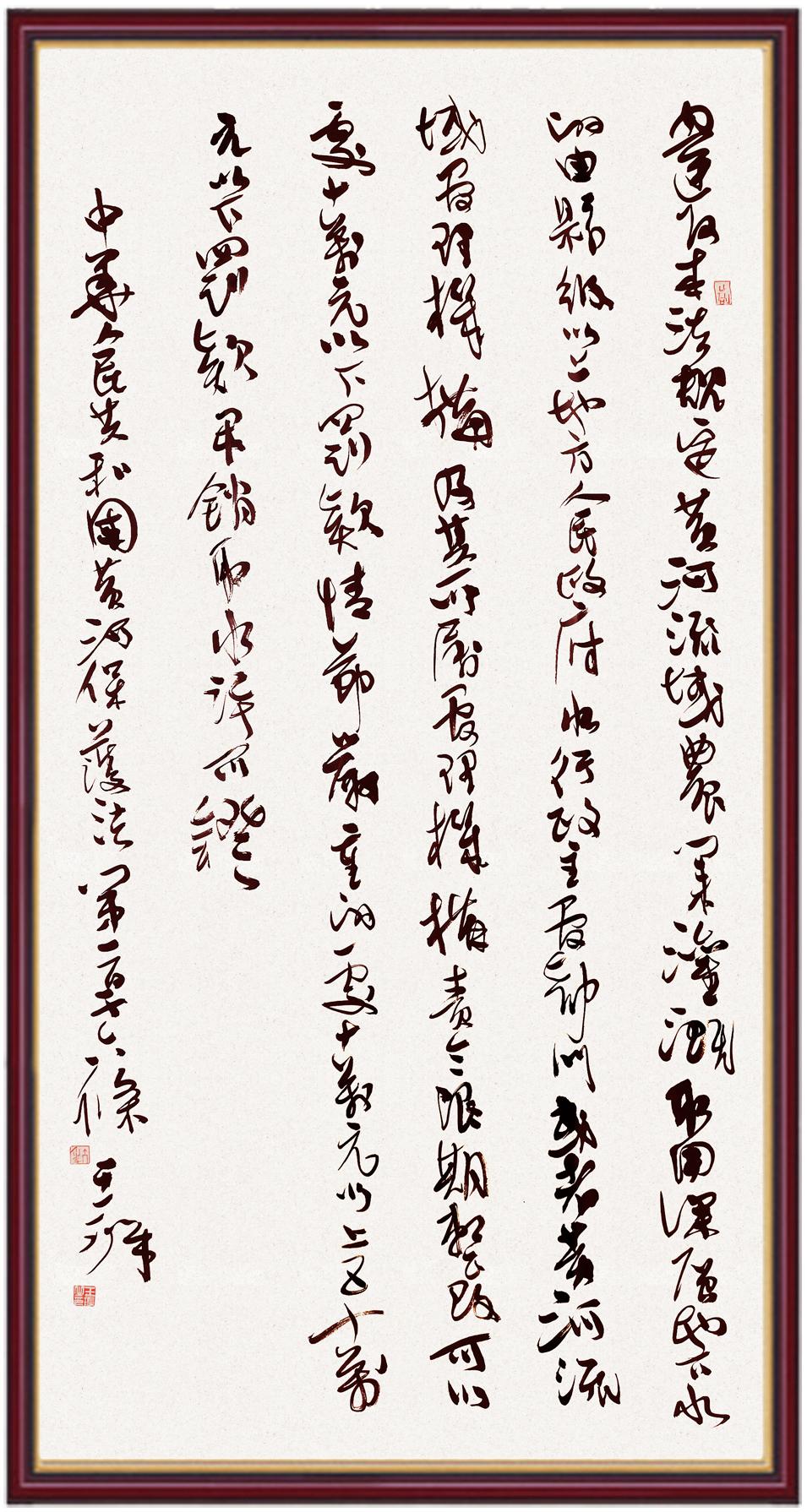 黃河寧,天下平。黃河是中華民族的發(fā)源地和搖籃,保護(hù)黃河是事關(guān)中華民族偉大復(fù)興的千秋大計(jì)?!吨腥A人民共和國(guó)黃河保護(hù)法》為推進(jìn)水資源節(jié)約集約利用、保護(hù)傳承弘揚(yáng)黃河文化、推動(dòng)黃河流域生態(tài)保護(hù)和高質(zhì)量發(fā)展提供了有力法治保障。繼書寫《中華人民共和國(guó)民法典》《中華人民共和國(guó)憲法》《中華人民共和國(guó)澳門特別行政區(qū)基本法》《中華人民共和國(guó)香港特別行政區(qū)基本法》《中華人民共和國(guó)國(guó)旗法》《中華人民共和國(guó)國(guó)徽法》《中華人民共和國(guó)國(guó)歌法》《中華人民共和國(guó)法官法》等法律法規(guī)之后,法制日?qǐng)?bào)社聯(lián)合沿黃九省(區(qū))司法廳、書法家協(xié)會(huì),將筆端對(duì)準(zhǔn)《中華人民共和國(guó)黃河保護(hù)法》。